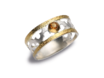 Szeroka obrączka wykonana ze srebra próby 925 to mistrzowskie połączenie jubilerskiej precyzji i artystycznej swobody. Jej powierzchnia zachwyca bogatą, rzeźbiarską teksturą, która w górnej części została uszlachetniona grubą warstwą 22-karatowego złota, tworząc dynamiczny kontrast z chłodnym odcieniem srebra. Kompozycja została wzbogacona o błękitne topazy o czystej, krystalicznej barwie, które osadzono w ozdobnych, wypukłych oprawach przypominających organiczne formy. Liczne drobne detale i nieregularne zdobienia nadają pierścionkowi unikatowego charakteru, sprawiając, że każdy egzemplarz staje się małym dziełem sztuki. Dzięki swojej masywnej formie i wyrazistemu wzornictwu biżuteria ta stanowi idealny wybór dla kobiet, które pragną podkreślić swoją indywidualność i cenią luksusowe dodatki o nieoczywistym designie.