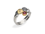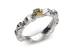 Niebanalna forma i mistrzowskie wykonanie sprawiają, że pierścionek stanowi urzekającą propozycję dla miłośniczek biżuterii autorskiej. Projekt wykonany ze srebra najwyższej próby 925 zachwyca nieregularną, fakturowaną koroną, której organiczny kształt przywodzi na myśl rzeźbiarskie dzieło sztuki. Brzegi oprawy zostały podkreślone akcentami złoconymi 22-karatowym złotem, co nadaje całości luksusowego wyrazu i pięknie kontrastuje z chłodnym odcieniem srebra. W samym sercu kompozycji osadzono tanzanit o unikatowej, fioletowo-niebieskiej barwie, który zmienia swój odcień w zależności od kąta padania światła. Całość opiera się na gładkiej, komfortowej obrączce, która pozwala artystycznej górze pierścionka grać główną rolę.