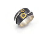Prezentowany artystyczny pierścionek zachwyca swoją rzeźbiarską formą, która w mistrzowski sposób łączy surowy charakter z wyrafinowaną elegancją. Wykonano go ręcznie z najwyższej jakości srebra próby 925, które zostało częściowo wykończone szlachetnym złoceniem 22-karatowym złotem, tworząc efektowny kontrast faktur i barw. Centralny element stanowi głęboko osadzony czarny diament, który swoim tajemniczym blaskiem nadaje całości niezwykłego charakteru. Nieregularna, organiczna struktura nawiązuje do stylu boho, czyniąc ten projekt doskonałym wyborem dla osób poszukujących nietuzinkowej biżuterii z duszą. Każdy egzemplarz jest małym dziełem sztuki, które wspaniale dopełni zarówno codzienne stylizacje, jak i wyjściowe kreacje, podkreślając indywidualny gust swojej właścicielki.