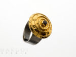 Artystyczny pierścionek wykonany ze srebra próby 925, oksydowany oraz złocony 22 karatowym złotem. Na ciekawie wypracowanej szynie pierścionka umieszczono dwa podwójne koła - oksydowane i złocone. Dodatkowym elementem ozdobnym jest granulacja wewnątrz kół, która pięknie kontrastuje ze złoceniem. Pierścionek jest bardzo wygodny i wspaniale prezentuje się na dłoni, wysmukla zdecydowanie palce. Pierścionek został wypracowany z wielką precyzją, w całości ręcznie.