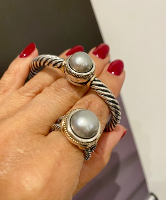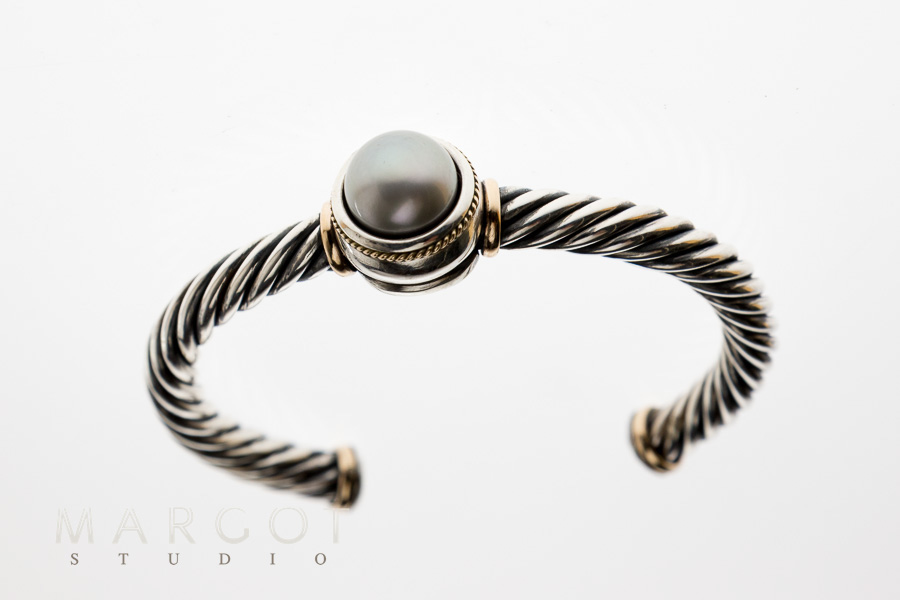 Oryginalna, wyjątkowa bransoleta srebrna (AG925), w połączeniu ze złotem (AU375). W centrum osadzono naturalną, hodowaną perłę barwy lekko szarej. Oprawa perły pełna, wzbogacona elementami złota. Srebro lekko oksydowane. Całość nawiązuje do stylu retro. Perfekcyjna, ręczna praca złotnicza. Detale wypracowane perfekcyjnie. Wysokiej jakości design wykorzystujący wartościowe materiały. Bransoleta zwraca uwagę i zachwyca formą. Bardzo lekka, doskonale układa się na nadgarstku.