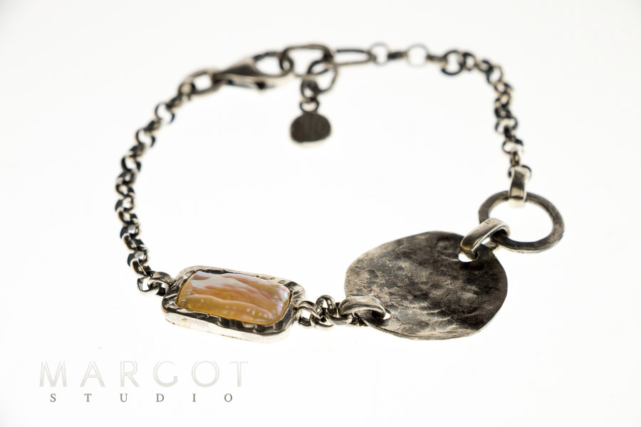 Ta delikatna bransoletka to idealne połączenie dobrego stylu z naturalną elegancją. Wykonana z oksydowanego srebra najwyższej próby, jej subtelny łańcuszek typu rolo doskonale układa się na nadgarstku. Centralnym punktem jest podłużna perła hodowana barwy białej, o beżowym overtonie, artystycznie oprawiona. Po drugiej stronie, okrągły element o ciekawie fakturowanej powierzchni, co przyciąga wzrok i podkreśla ręczne, unikalne wykonanie wyrobu. Bransoletka zapinana jest na duży i wygodny karabinek oraz ma łańcuszek tzw. przedłużkę, co pozwala na regulację długości, zapewniając idealne dopasowanie.