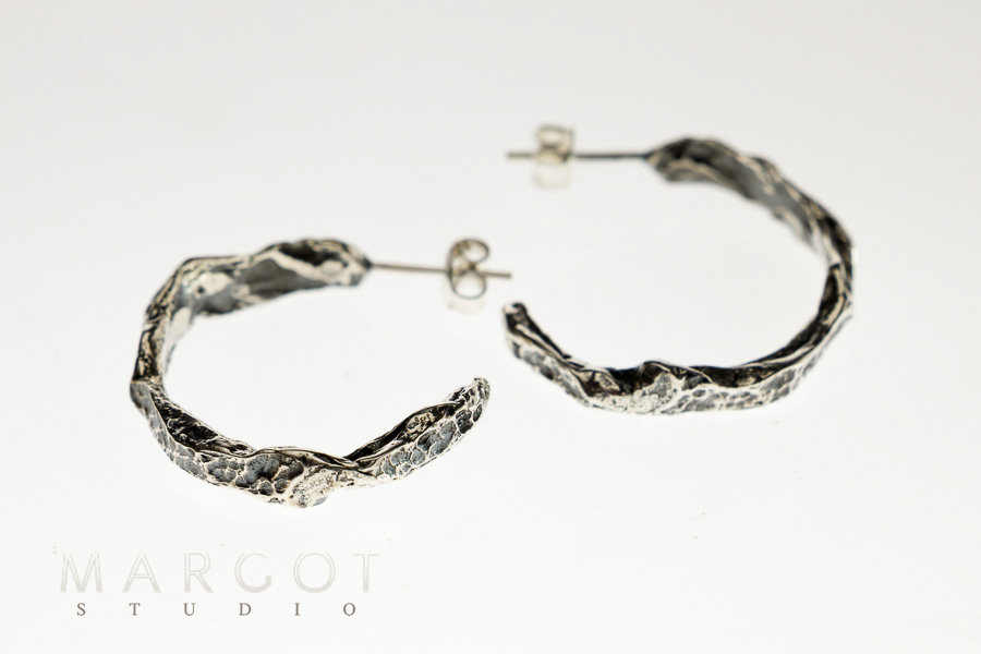 Artystyczne, okrągłe kolczyki wykonane ze srebra próby 925. Kolczyki zostały całkowicie wykonane ręcznie. Intrygująco wypracowana faktura kolczyków przyciąga uwagę. Są lekkie i bardzo elegancko prezentują się na uchu. Zakładane na sztyfty z zapięciem typu motylek.