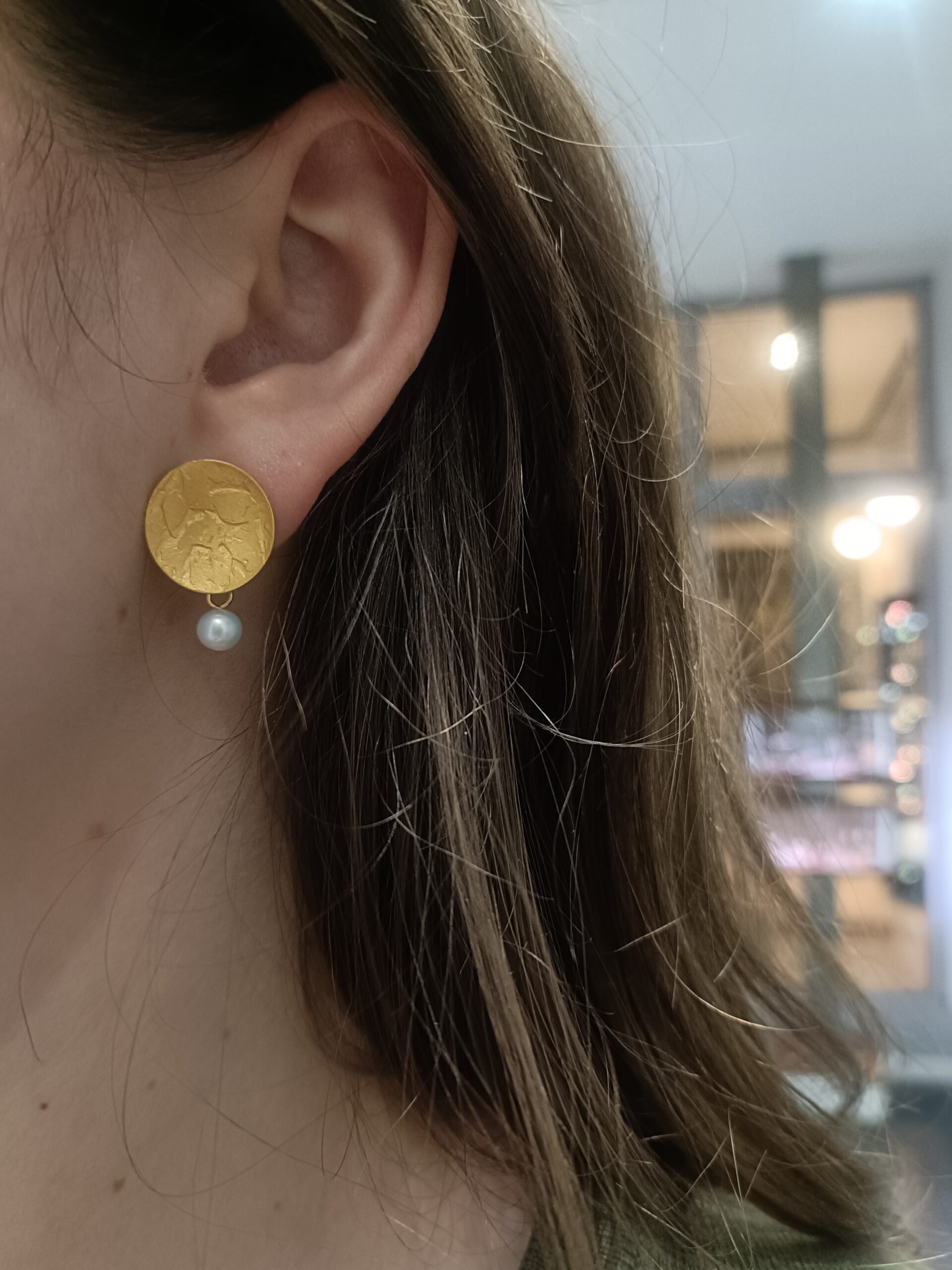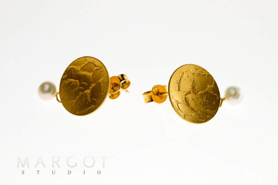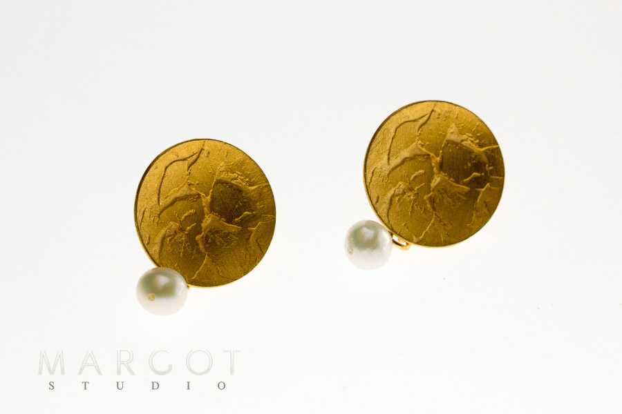 kolczyki artystyczne Margot studio, biżuteria artystyczna, srebrne kolczyki złocone, kolczyki z perłami, kolczyki na sztyfty, rękodzieło,