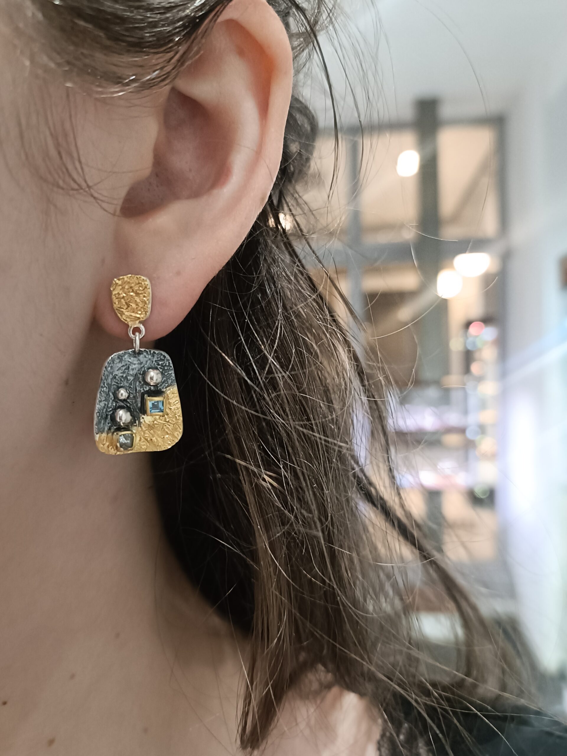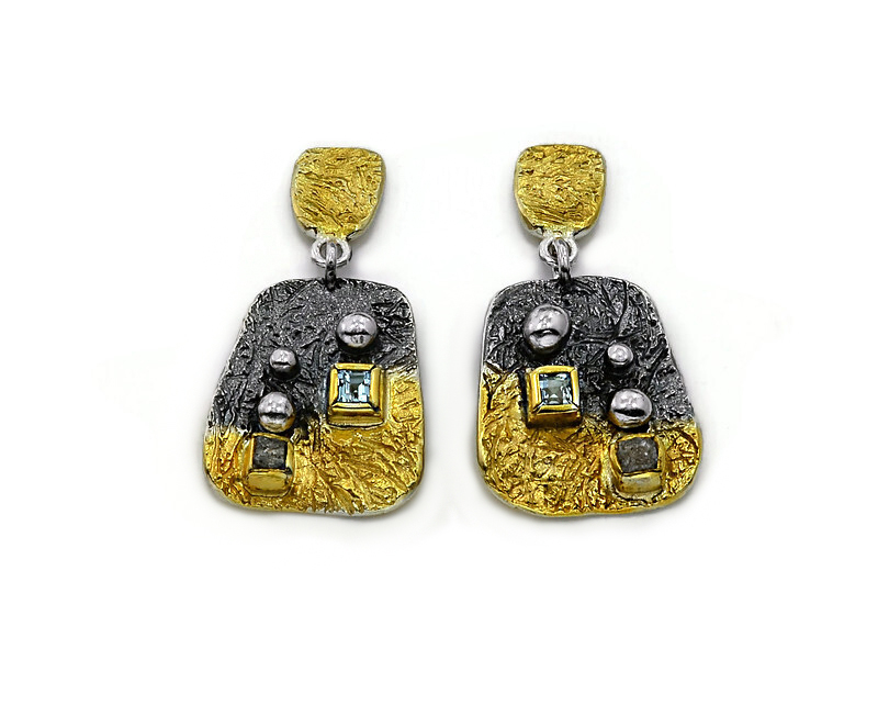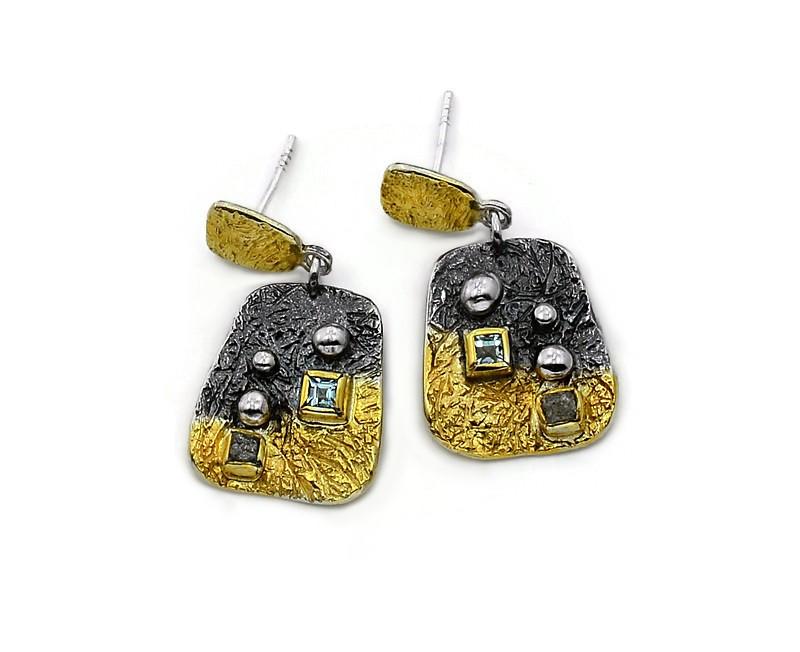 Artystyczne, eleganckie kolczyki wykonane ze srebra próby 925, oksydowane i złocone 22 karatowym złotem. Faktura kolczyków została ciekawie wypracowana, w pełnych oprawach na kolczykach osadzono niebieskie topazy i surowe diamenty, które pięknie kontrastują ze złocieniem i oksydowaniem. Dodatkowym elementem ozdobnym są srebrne, delikatne kuleczki. Kolczyki zakładane są na sztyfty z zapięciem typ tulejka. Kolczyki są bardzo lekkie, perfekcyjnie wykonane ręcznie. Te kolczyki będą wyjątkowym akcentem artystycznym w każdej stylizacji.