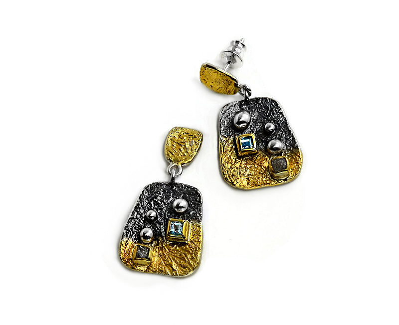 Artystyczne, eleganckie kolczyki wykonane ze srebra próby 925, oksydowane i złocone 22 karatowym złotem. Faktura kolczyków została ciekawie wypracowana, w pełnych oprawach na kolczykach osadzono niebieskie topazy i surowe diamenty, które pięknie kontrastują ze złocieniem i oksydowaniem. Dodatkowym elementem ozdobnym są srebrne, delikatne kuleczki. Kolczyki zakładane są na sztyfty z zapięciem typ tulejka. Kolczyki są bardzo lekkie, perfekcyjnie wykonane ręcznie. Te kolczyki będą wyjątkowym akcentem artystycznym w każdej stylizacji.