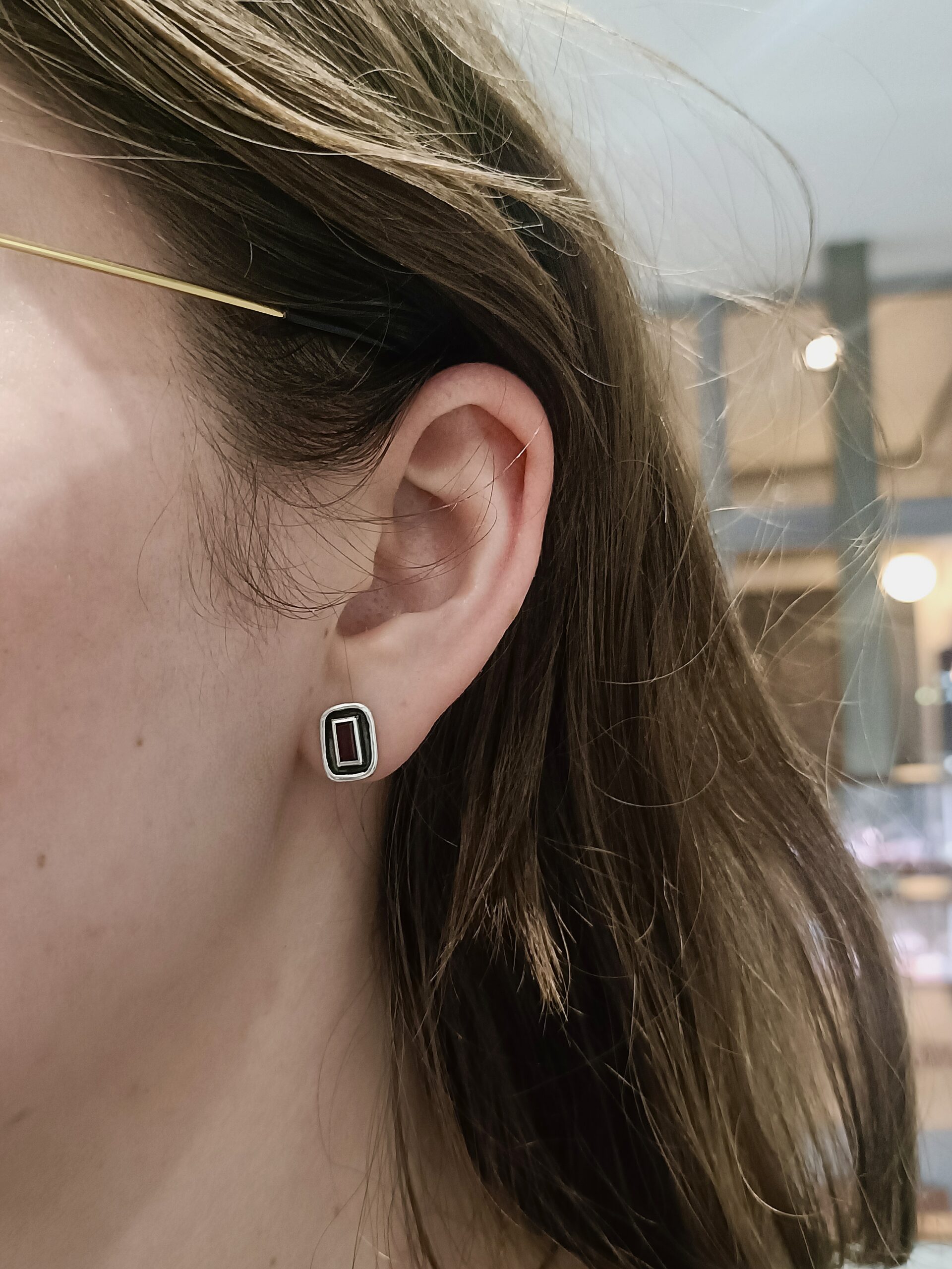 Eleganckie i delikatne kolczyki wykonane ze srebra próby 925, z elementami oksydowanymi. Kolczyki mają prostokątny kształt, ale narożniki są delikatnie zaokrąglone. W centrum osadzono granaty, fasetowanego szlifu, w pełnej jasno-srebrnej oprawie. Czerwony blask kamieni pięknie podbija srebro oksydowane. Kolczyki zakładane są na sztyfty z tulejką. Perfekcyjnie wykonane w całości ręcznie. Bardo lekkie. Doskonały detal do wielu kreacji i na różne okazje. Przykuwa uwagę ciekawym designem oraz perfekcją wykonania.