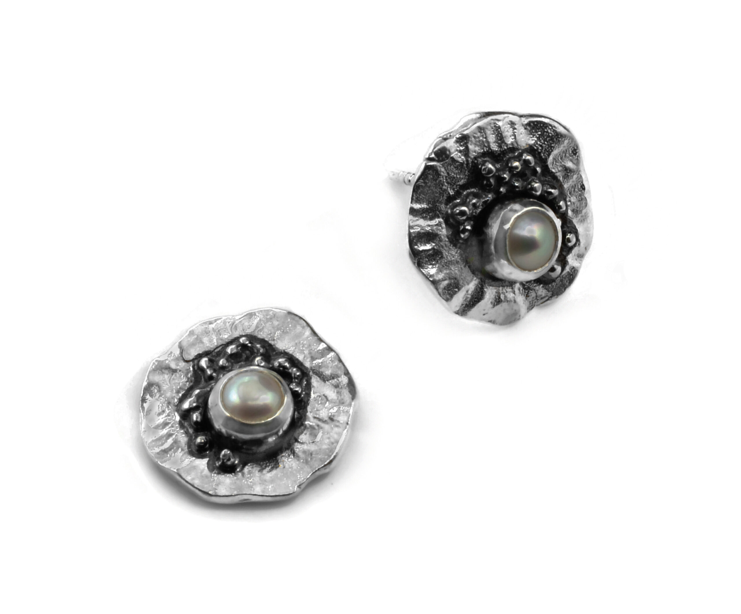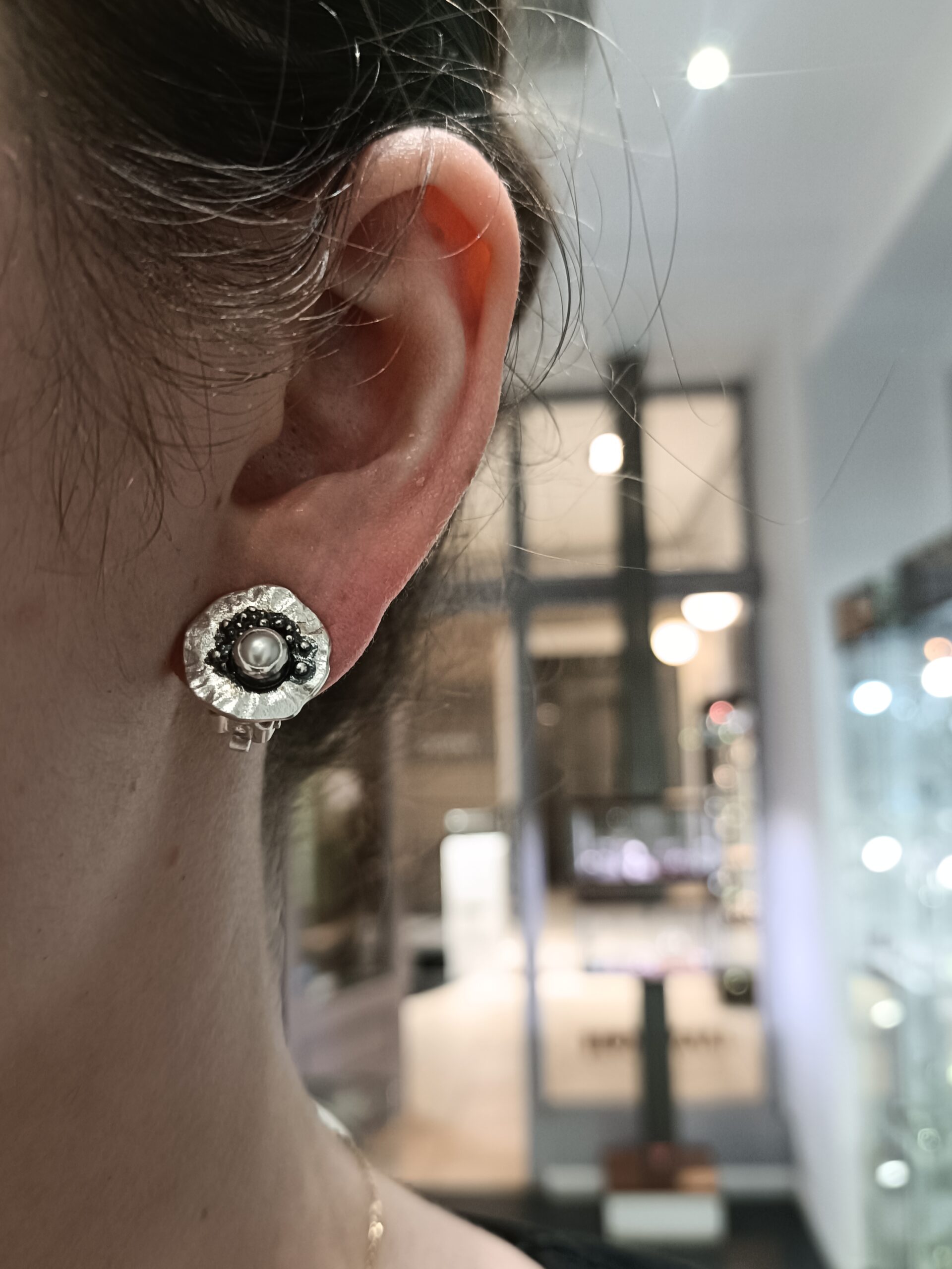 artystyczne klipsy z perłami, klipsy ze srebra artystyczna biżuteria Margot studio, unikatowe klipsy srebro oksydowane