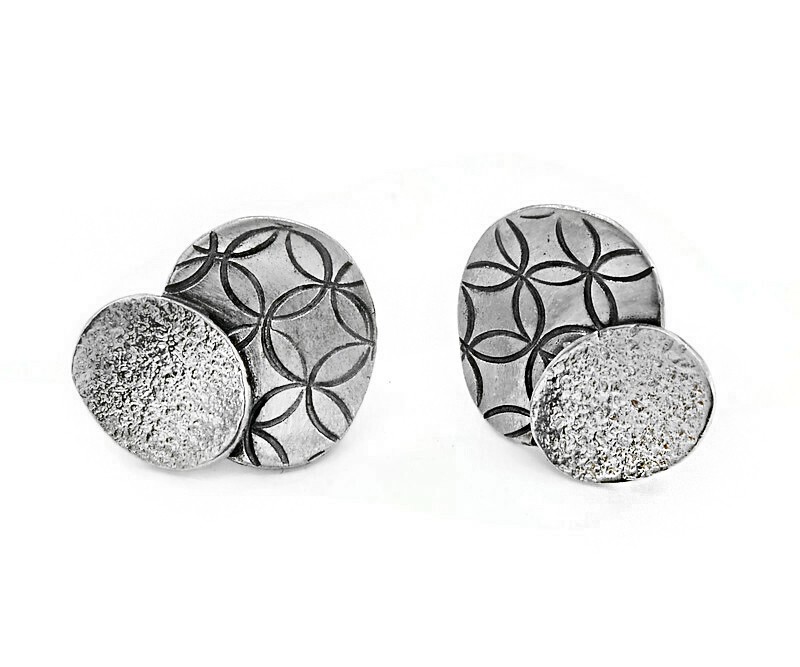 Większy element kolczyków zdobi ażurowy wzór inspirowany motywem “kwiatu życia”, a mniejszy element nachodzący, ma surową matową fakturę, która idealnie kontrastuje z ażurem.