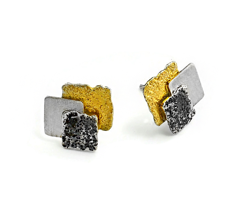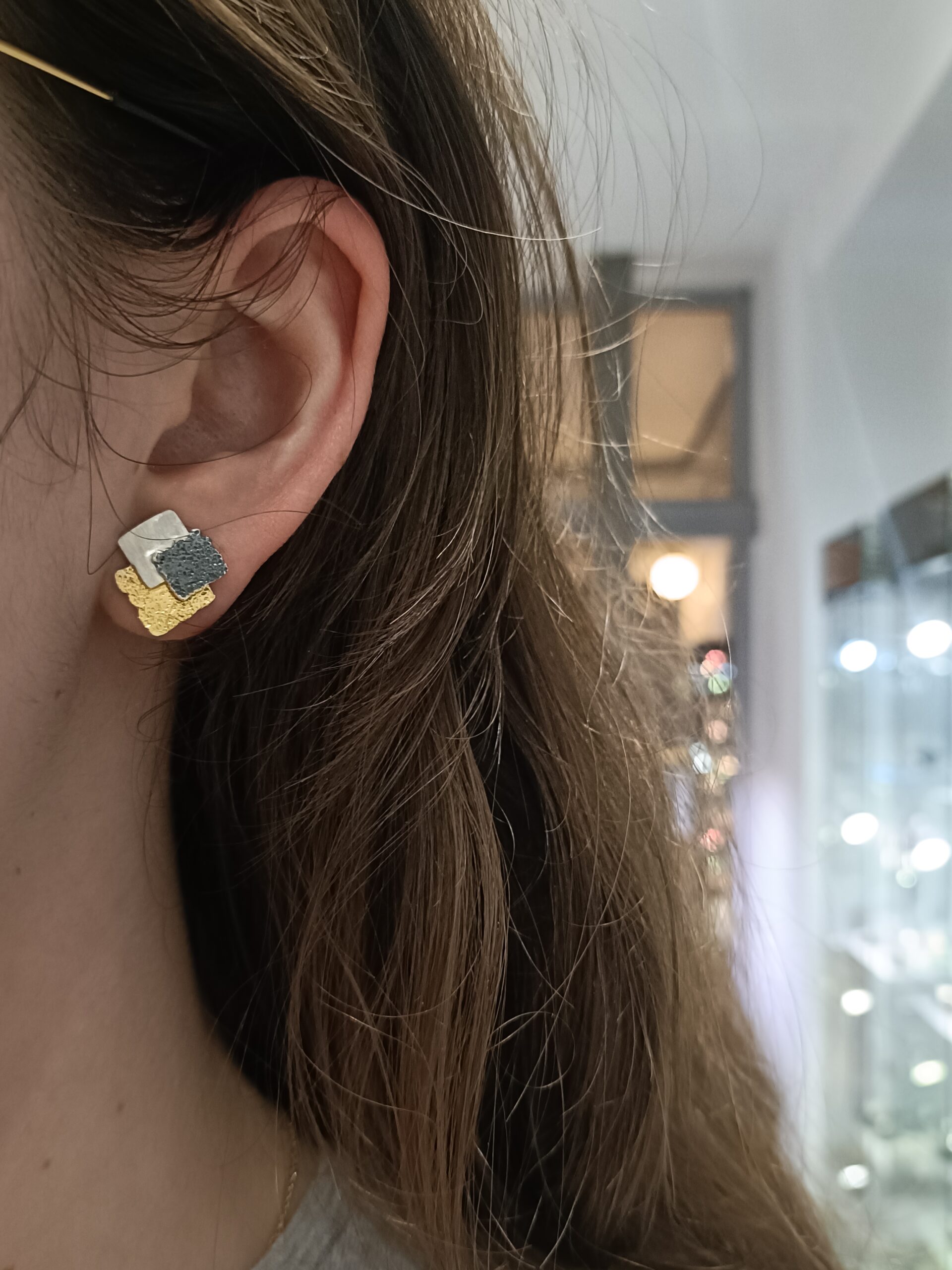 Artystyczne, ręcznie wykonane kolczyki srebrne, eksponujące 3 kolory srebra: jasne, oksydowane i złocone. Bardzo lekkie, zakładane na sztyfty z tulejką z jasnego srebra. Powierzchnia kolczyków ciekawie wypracowana. Kwadraty nakładające się na siebie dodają dynamiki biżuterii. Kolekcja limitowana.