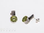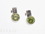 Oryginalne, srebrne kolczyki w pr. 925, lekko oksydowane. W centralnym punkcie wyeksponowano (pełna oprawka) cyrkonie koloru jasnozielonego.