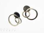 Artystyczne, wykonane ręcznie kolczyki ze srebra próby 925. Miejscami oksydowane. Zakładane na sztyfty z motylkiem. Bardzo lekkie. Fajnie prezentują się na uchu, okalając poduszki uszne. Nakładające się na siebie koła tworzą lekką, finezyjną przestrzeń.