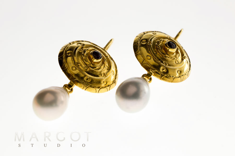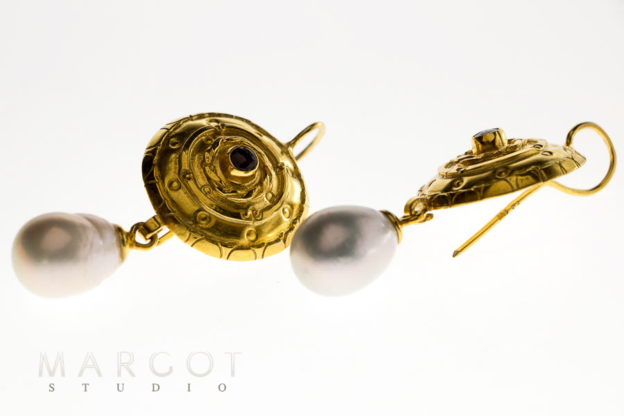 Artystyczne, bardzo efektowne kolczyki wykonane ręcznie ze srebra próby 925, złocone 22 karatowym złotem koloru żółtego. W centrum piękne granaty okrągłe, fasetowane barwy ciemnoczerwonej. Okrągłe elementy zdobione aplikacją nawiązują do okresu hellenistycznego. W dolnej części umieszczono perły hodowane słodkowodne, barwy białokremowej. Obie części miękko pracują. Kolczyki są zakładane na bigiel z zabezpieczeniem. Bardzo lekkie. Perfekcyjnie wykonane ręcznie, w jednym egzemplarzu. Wypracowane w każdym szczególe, prezentując kunszt pracy.