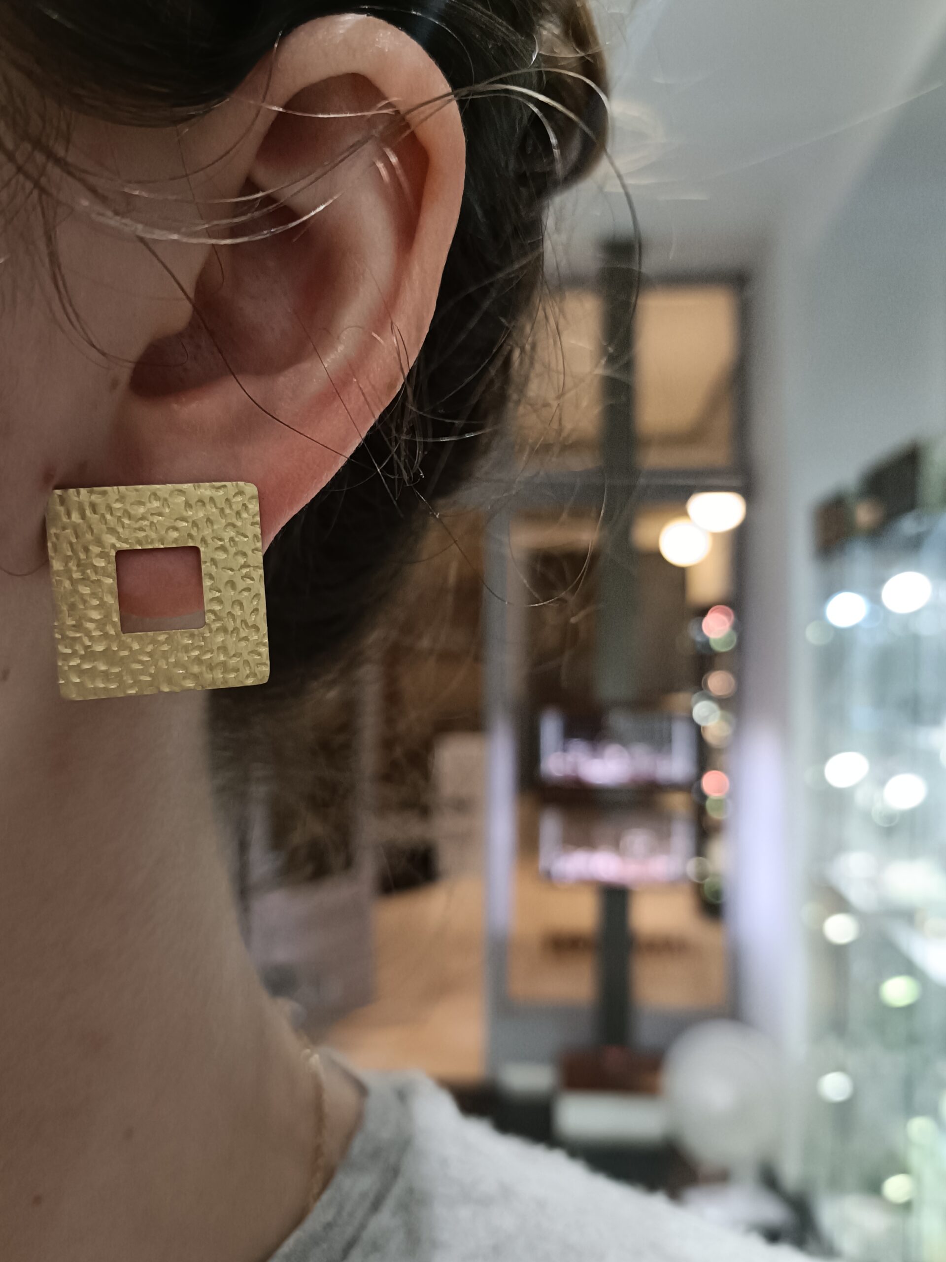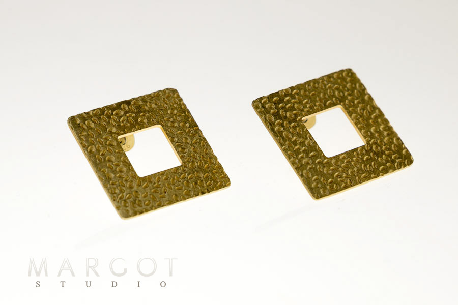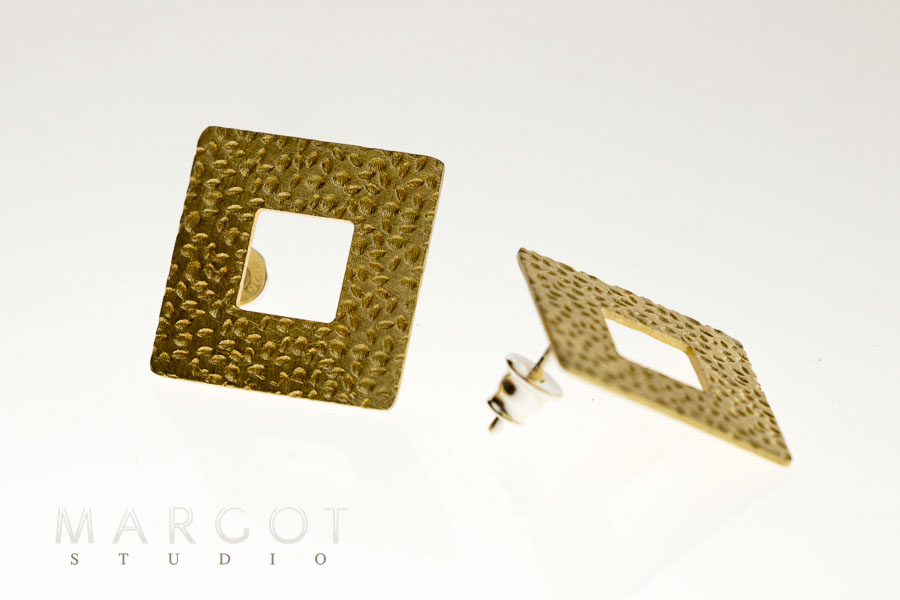 Artystyczne i minimalistyczne kolczyki wykonane z mosiądzu pokrytego polimerem. Polimer jest warstwą ochronną i dekoracyjną, nadaje trwały kolor. Nałożony polimer jest warstwą nieaktywną i nie podlega utlenianiu, a więc nie zmienia koloru. Jest odporny na pot i promieniowanie UV. Odporny jest również na ścieranie. Przyciągają uwagę ze względu na swój kwadratowy kształt oraz ciekawie wypracowaną fakturę. Kolczyki zakładane są na sztyfty z zapięciem typu tulejka. Są bardzo lekkie, nie obciążają ucha. Kolczyki te doskonale wpisują się w topowe trendy tego sezonu, w którym królują duże, geometryczne formy.