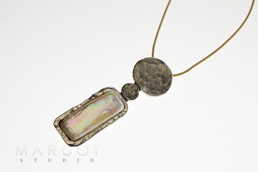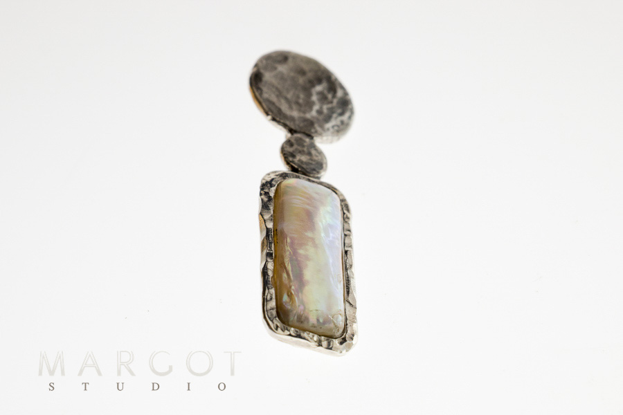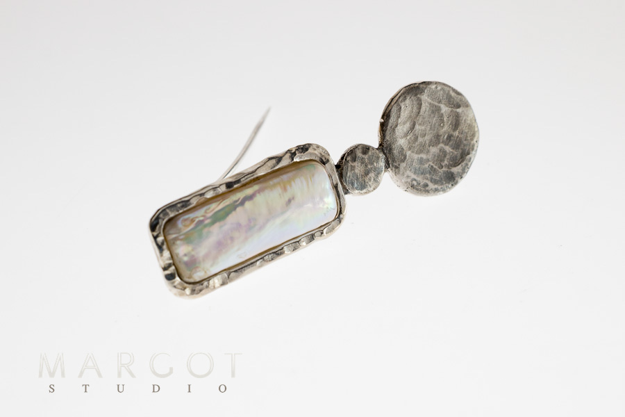Wyjątkowy, ręcznie wykonany broszko-wisior ze srebra próby 925, który zachwyca oryginalnym designem i szlachetnym blaskiem. Kompozycję tworzą trzy elementy: centralna prostokątna, subtelna perła barwy białej z overtonem lekko łososiowym, młotkowany srebrny krążek i delikatne kółko łącznik.