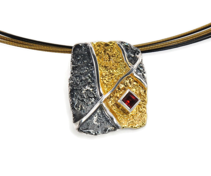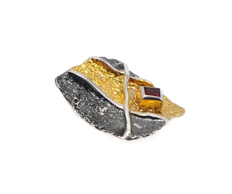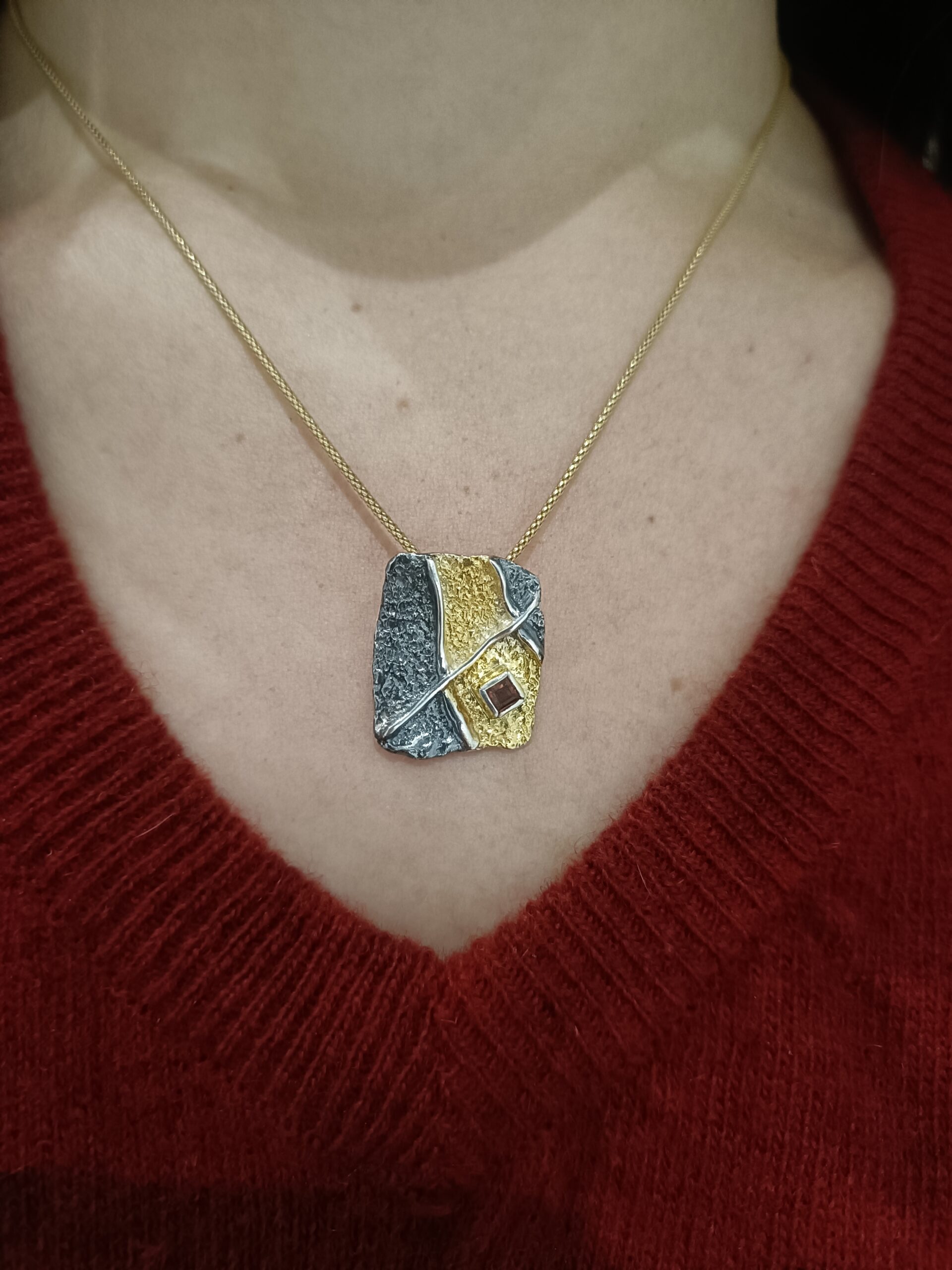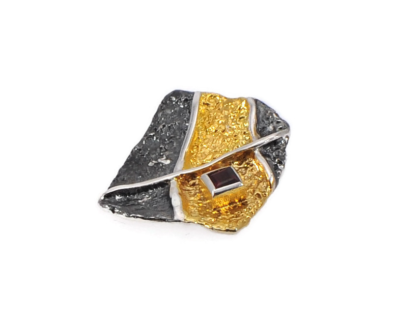 Delikatny i artystyczny wisior wykonany ze srebra próby 925, oksydowany i złocony 22 karatowym złotem. W pełnej oprawie osadzono fasetowany granat, który wspaniale komponuje się z ciekawie wypracowaną fakturą wisiora. Uchwyt duży umieszczony od spodu, dający możliwość zakładania na różne sposoby. Ozdobne przepski z jasnego wypukłego druciku. Ręczna, perfekcyjna praca złotnicza. Wisiorek stanowić będzie wyróżniający się detal w stylizacji. Ponadczasowy projekt. Design praktyczny w zastosowaniu.