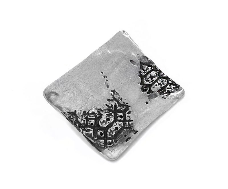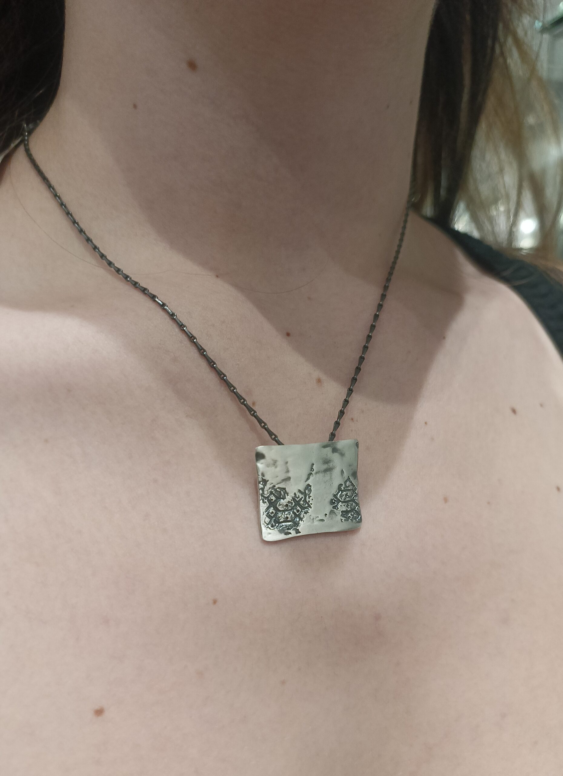 Bardzo oryginalny wisior w prostokątnym kształcie, wykonany ze srebra próby 925 z oksydowanymi akcentami. Faktura wisiora jest organiczna, geometrycznie wytłaczana i satynowana. Uchwyt pod spodem jest podwójny i dość duży, co daje możliwość swobodnego przekładania łańcuszków. Ręczna, perfekcyjna praca złotnicza. Stanowi wyróżniający się detal w stylizacji. Ponadczasowy projekt.