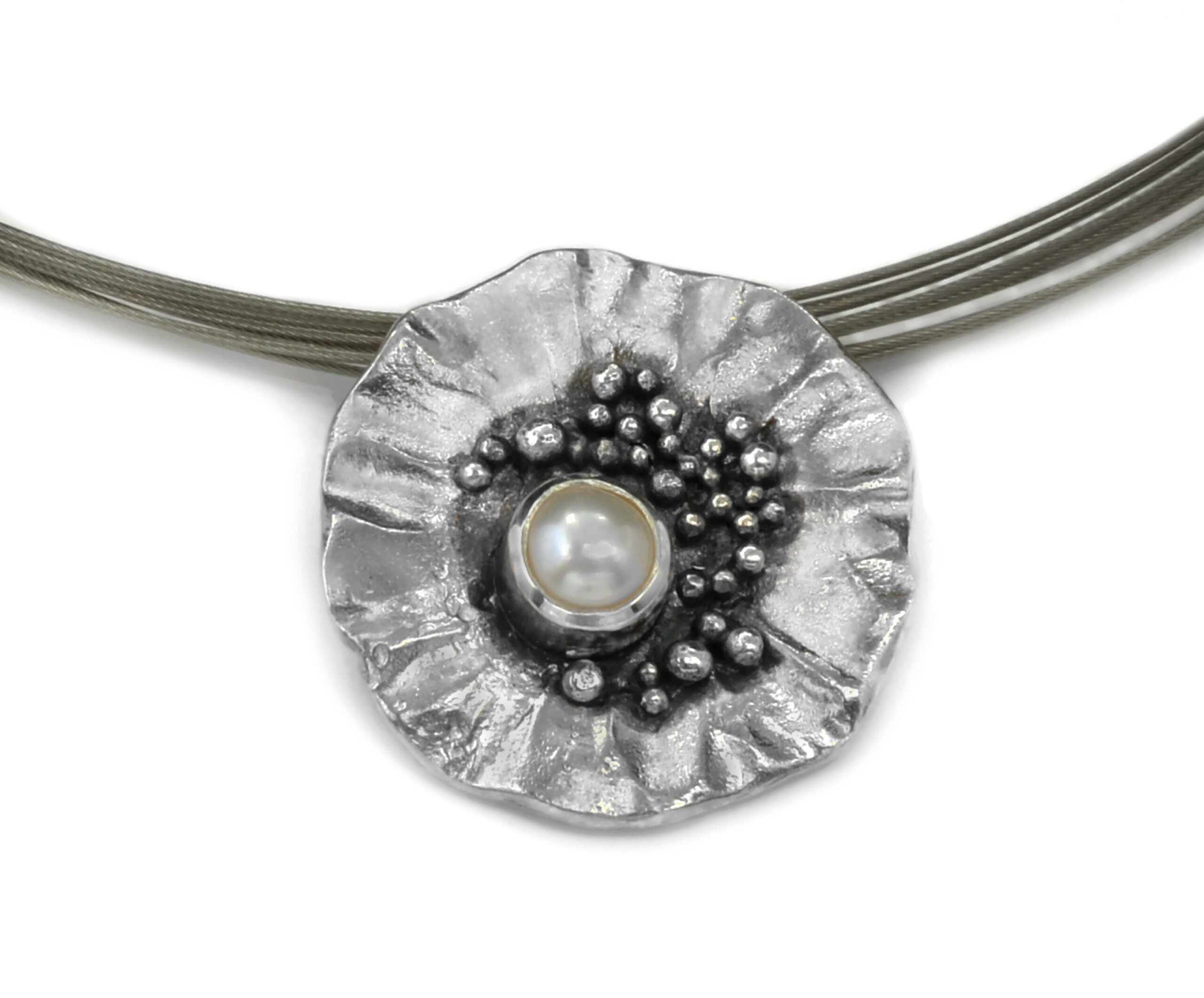Oryginalny wisior wykonany ze srebra próby 925, z elementami oksydowanymi w centrum osadzono perłę hodowaną, w białym kolorze. Perła pięknie kontrastuje z artystycznie wypracowaną strukturą srebra oksydowaną granulacją. Uchwyt wisiora jest dość szeroki, dzięki czemu można go zakładać na różne łańcuszki. Bardzo lekki i perfekcyjnie wykonany ręcznie, w jednostkowym egzemplarzu.