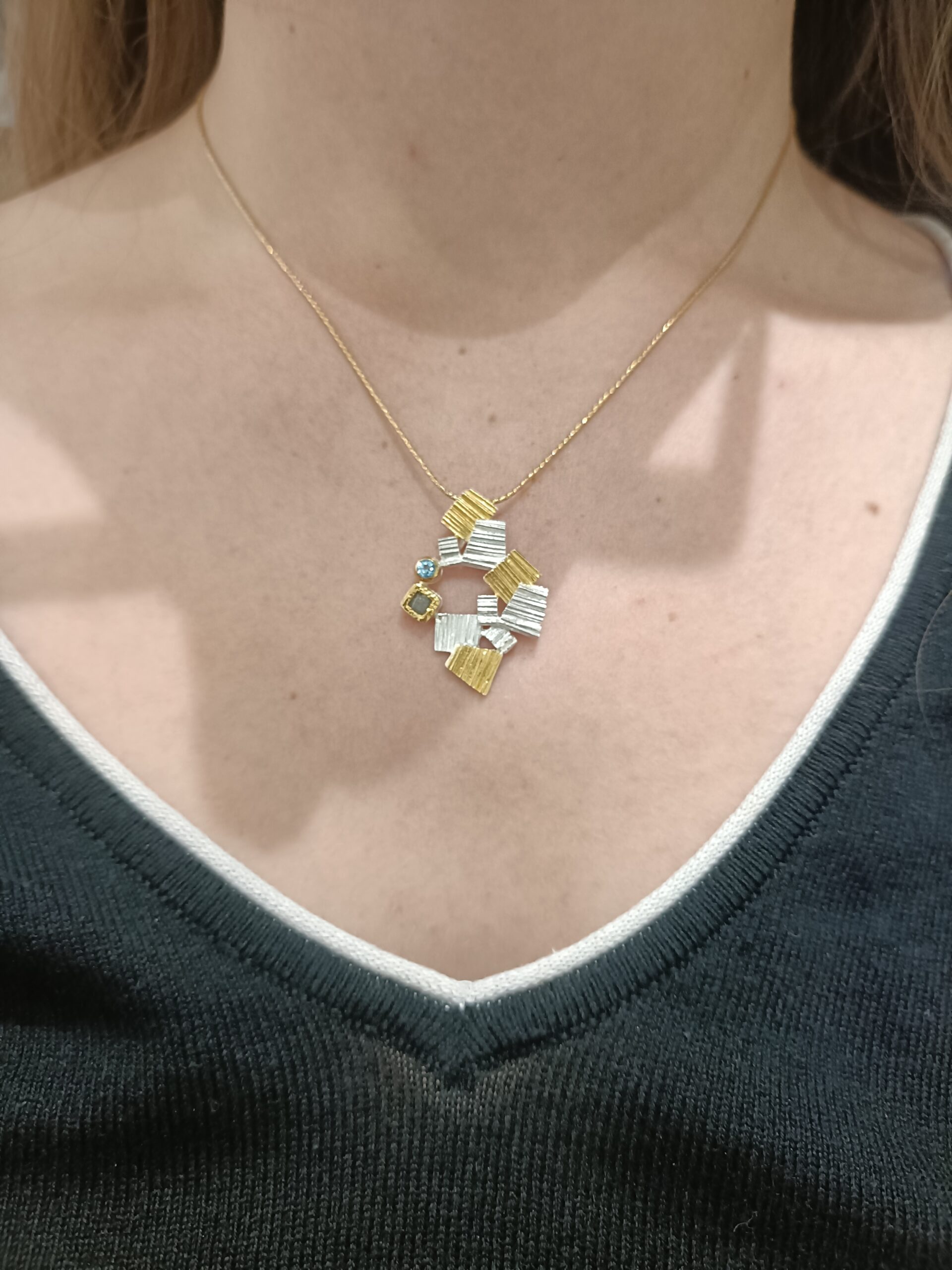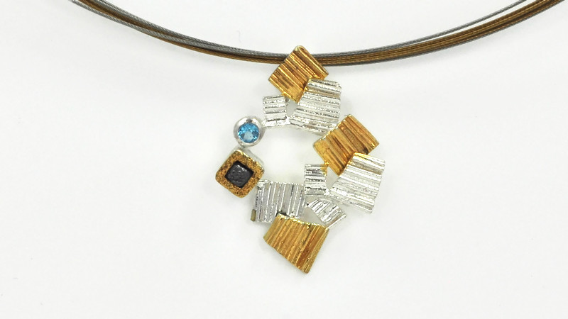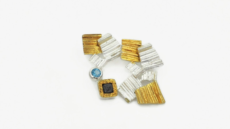 Oryginalny, artystyczny wisiorek srebrny pr. 925, ze złoconymi 22 karatowym złotem, akcentami. W roli głównej surowy minerał diamentu i okrągły topaz niebieski, fasetowany. Elementy są połączone w nieregularny sposób, a wśród nich iskrzą naturalne kamienie. Urokliwa i interesująca praca artystki.