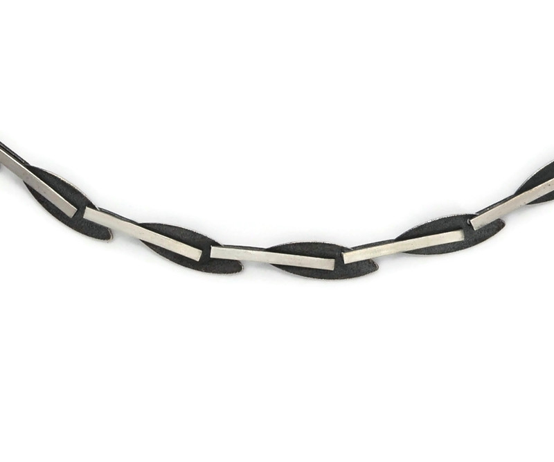 Ten minimalistyczny, a zarazem wyrazisty naszyjnik to pochwała nowoczesnego designu i kunsztu jubilerskiego. Biżuteria została wykonana z najwyższej próby srebra 925, któremu nadano subtelne, satynowane wykończenie, co owocuje szlachetnym, matowym blaskiem. Wyjątkowy charakter projektu podkreślają kontrastujące, oksydowane akcenty, które nadają całości głębi i surowej elegancji. Geometryczna forma naszyjnika, składająca się z precyzyjnie połączonych ogniw, sprawia, że biżuteria układa się miękko i idealnie przylega do ciała. Jest to propozycja dla osób poszukujących dodatków o unikatowej fakturze, które łączą w sobie chłodny minimalizm z wyrafinowanym detalem. Naszyjnik stanowi doskonały wybór zarówno do biurowej białej koszuli, jak i do odważniejszych, wieczorowych stylizacji, dodając im artystycznego sznytu.