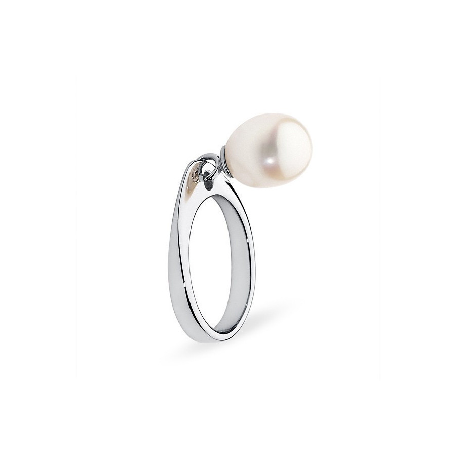 Pierścionek srebrny z perłą hodowaną koloru białego. Do wykonania pierścionka zostały użyte najwyższej jakości materiały – perła słodkowodna- kształt lekki sopel i srebro rodowane w próbie 925. Perła lekko porusza się. Wyrób prezentuje się bardzo elegancko i może być dopełnieniem codziennej lub wieczorowej stylizacji. Będzie też pięknym dodatkiem na bardzo specjalne okazje. Oryginalna praca złotnicza.