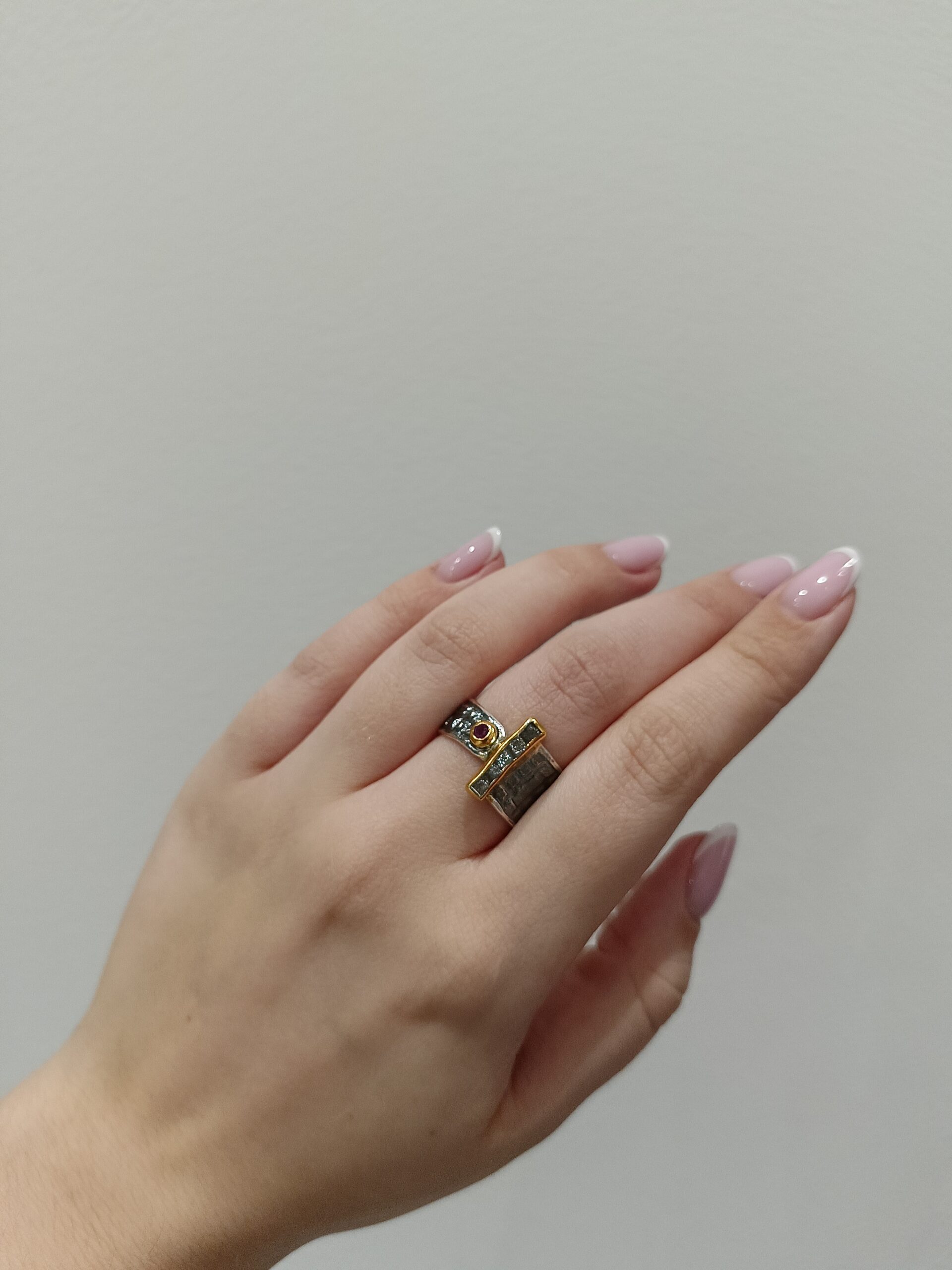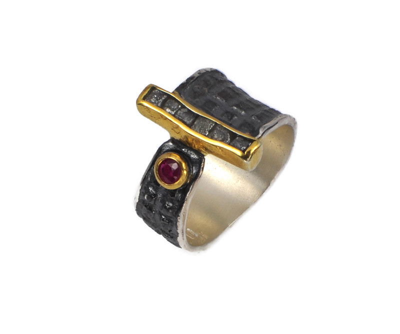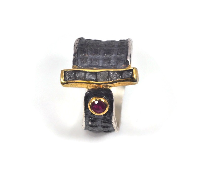 Artystyczny, wyjątkowy pierścionek wykonany ze srebra próby 925, oksydowany i złocony 22 karatowym złotem. Szyna pierścionka jest oksydowana, ma nieregularny kształt, a jej faktura jest geometryczna. W roli głównej są surowe diamenty i rubin, które tworzą harmonijną i ciekawą zarazem całość. Kamienie zostały osadzone w pełnych, złoconych oprawach. Pierścionek przyciąga wzrok i wspaniale zdobi dłoń. Naturalne kamienie dodają mu elegancji, tworząc wyjątkową biżuterię, która doskonale podkreśla indywidualny styl. Pierścionek jest bardzo wygodny.