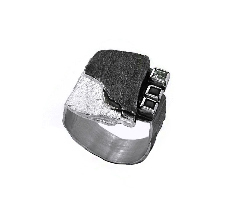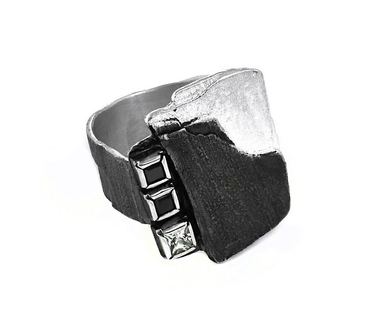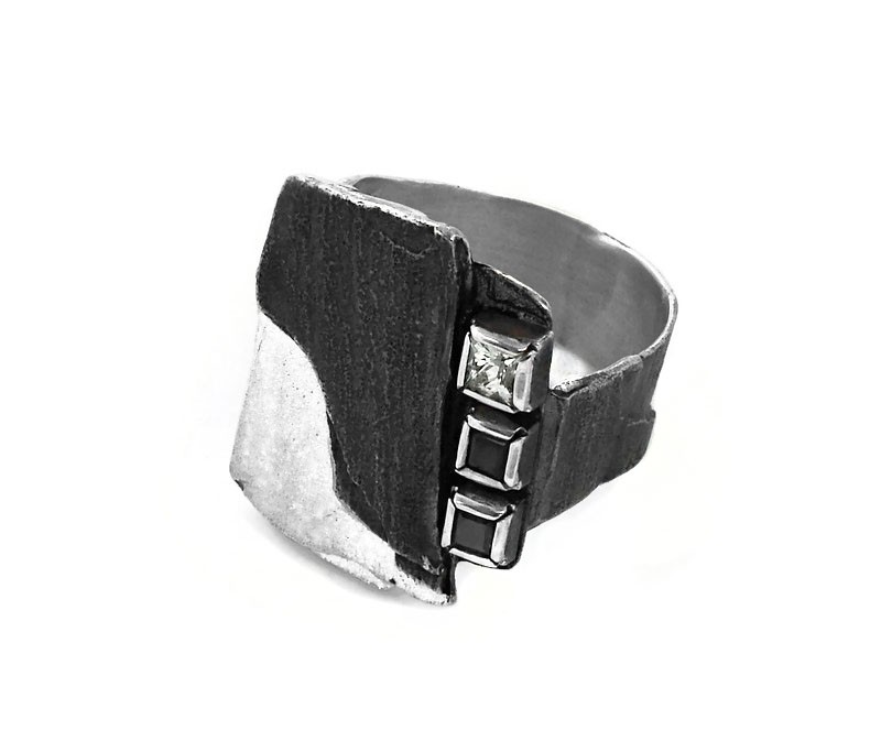 Unikatowy pierścionek wykonany ze srebra próby 925, oksydowany. Faktura pierścionka została artystycznie wypracowana, co pięknie podkreśla oksydowanie łączone z jasnym srebrem. Dodatkowym elementem ozdobnym pierścionka są naturalne kamienie. Połączenie czarnych spineli z białym szafirem, dodaje całości elegancji i oryginalności. Bardzo elegancko prezentuje się na dłoni, co więcej szyna pierścionka zwęża się pod palcem zwiększając komfort noszenia. Pięknie wysmukla i wydłuża palce. Ciekawa forma dla osób ceniących sobie klasykę, elegancję i nowoczesną nutę. Wysoka jakość pracy. Design o uniwersalnym zastosowaniu i bardzo ergonomiczny.