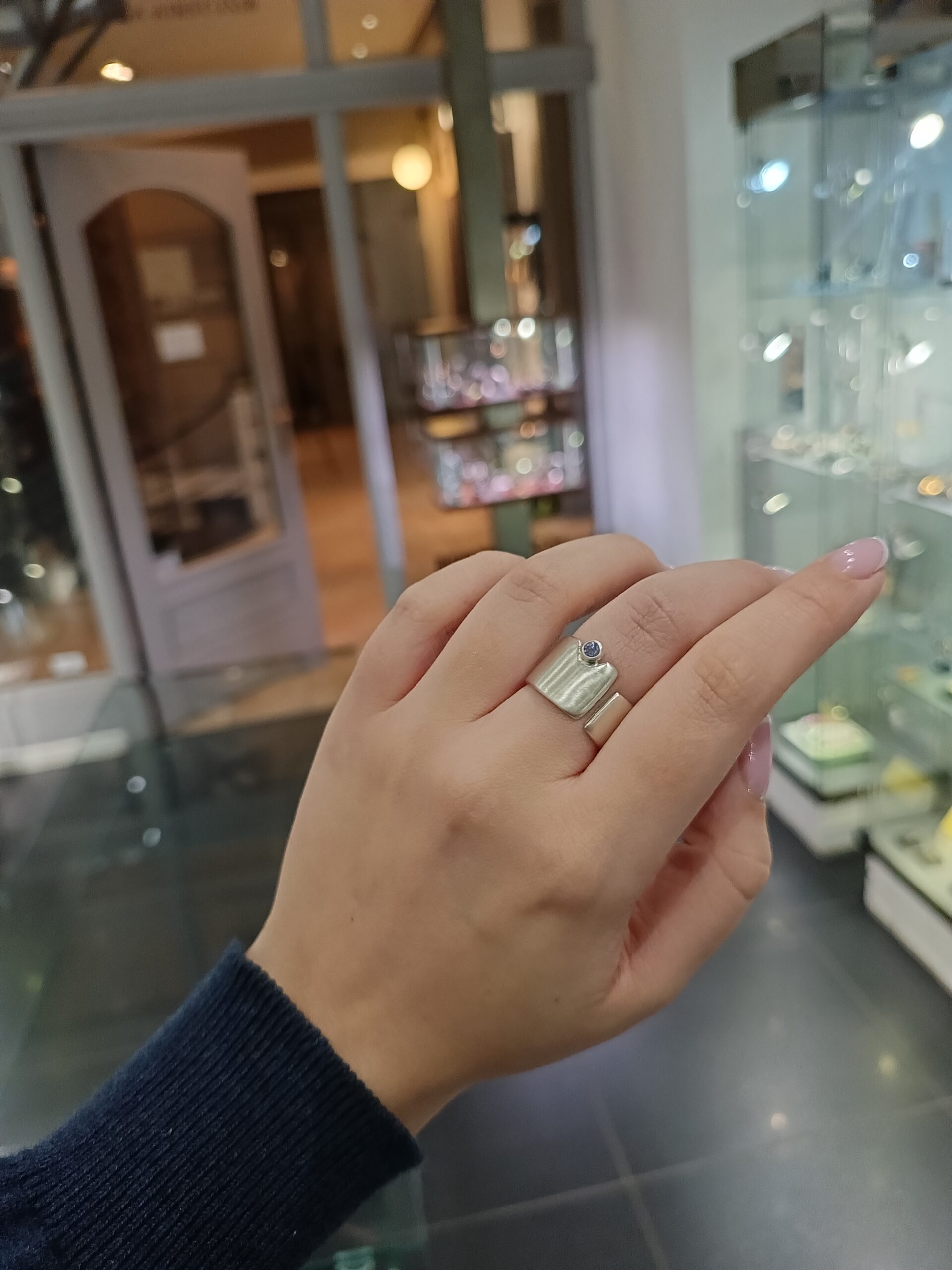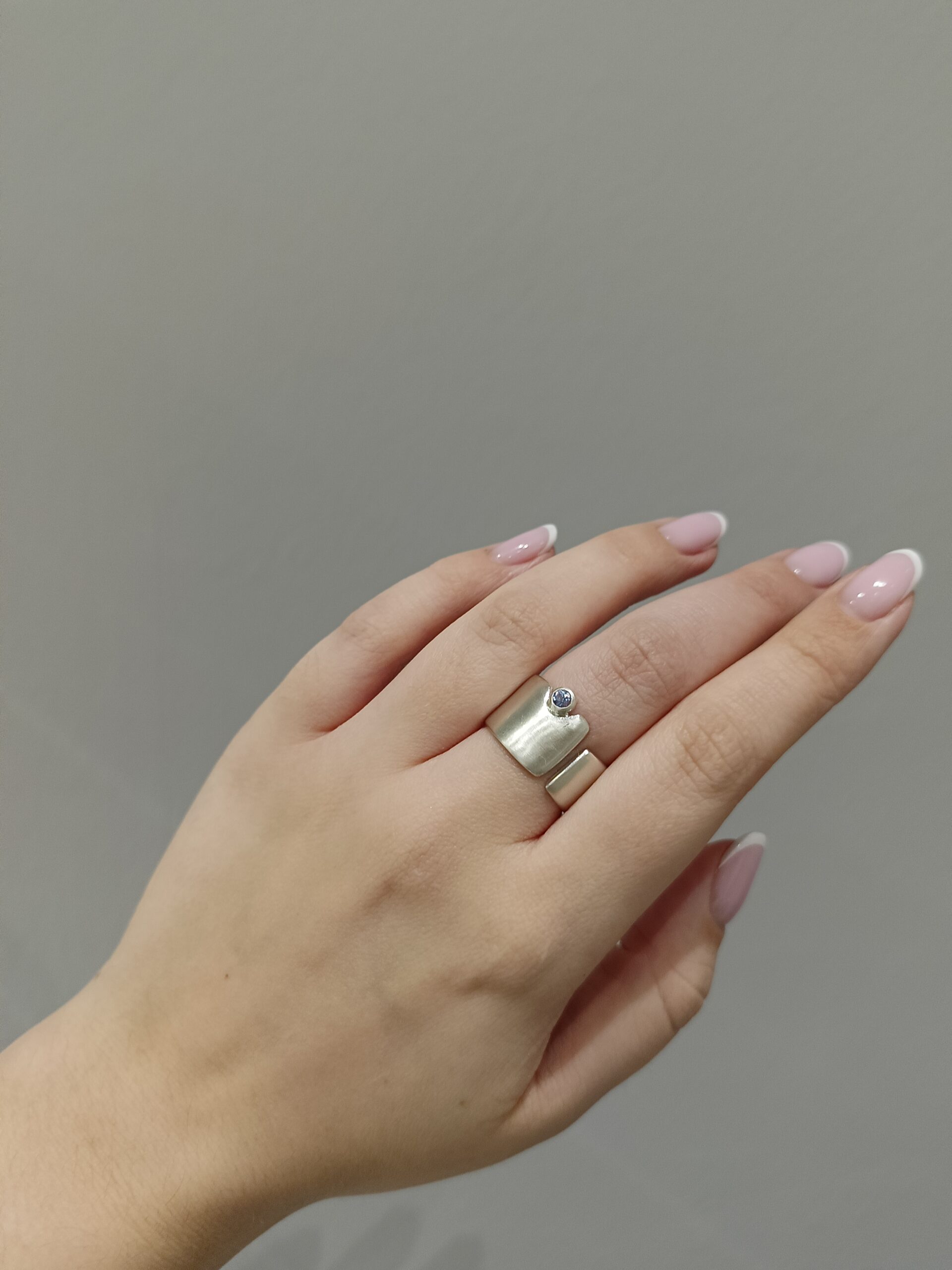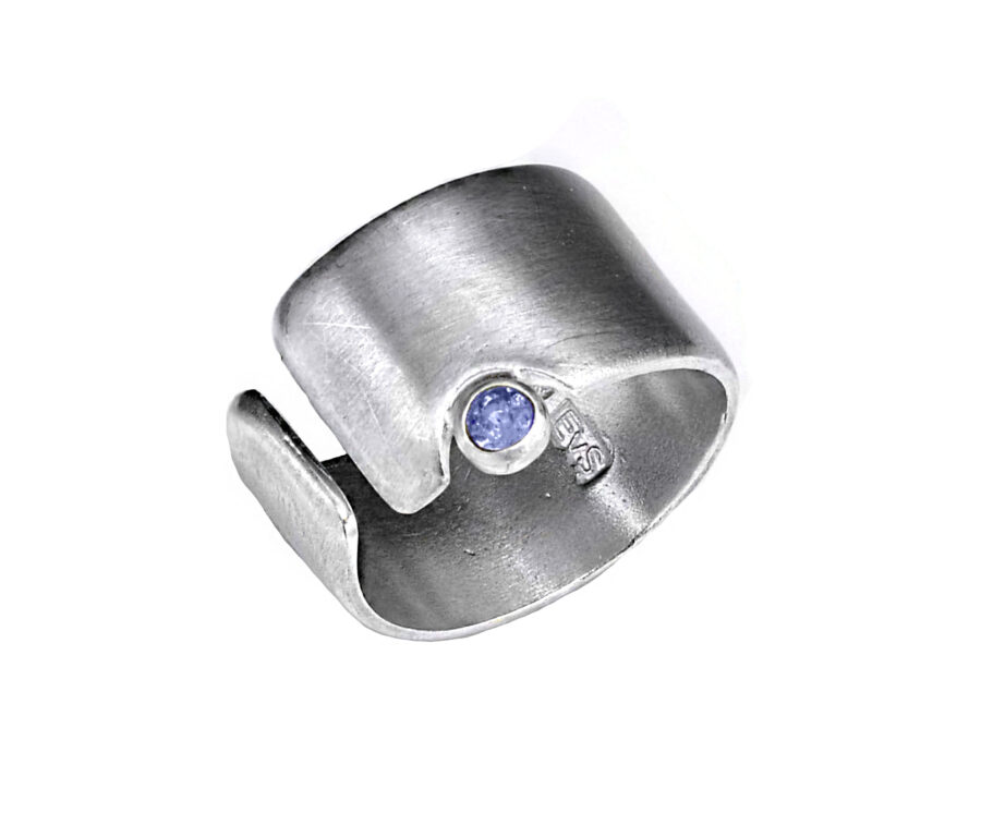 szeroka srebrna obrączka, srebro satynowane, obrączka z tanzanitem, artystyczna obrączka ze srebra, unikatowa biżuteria