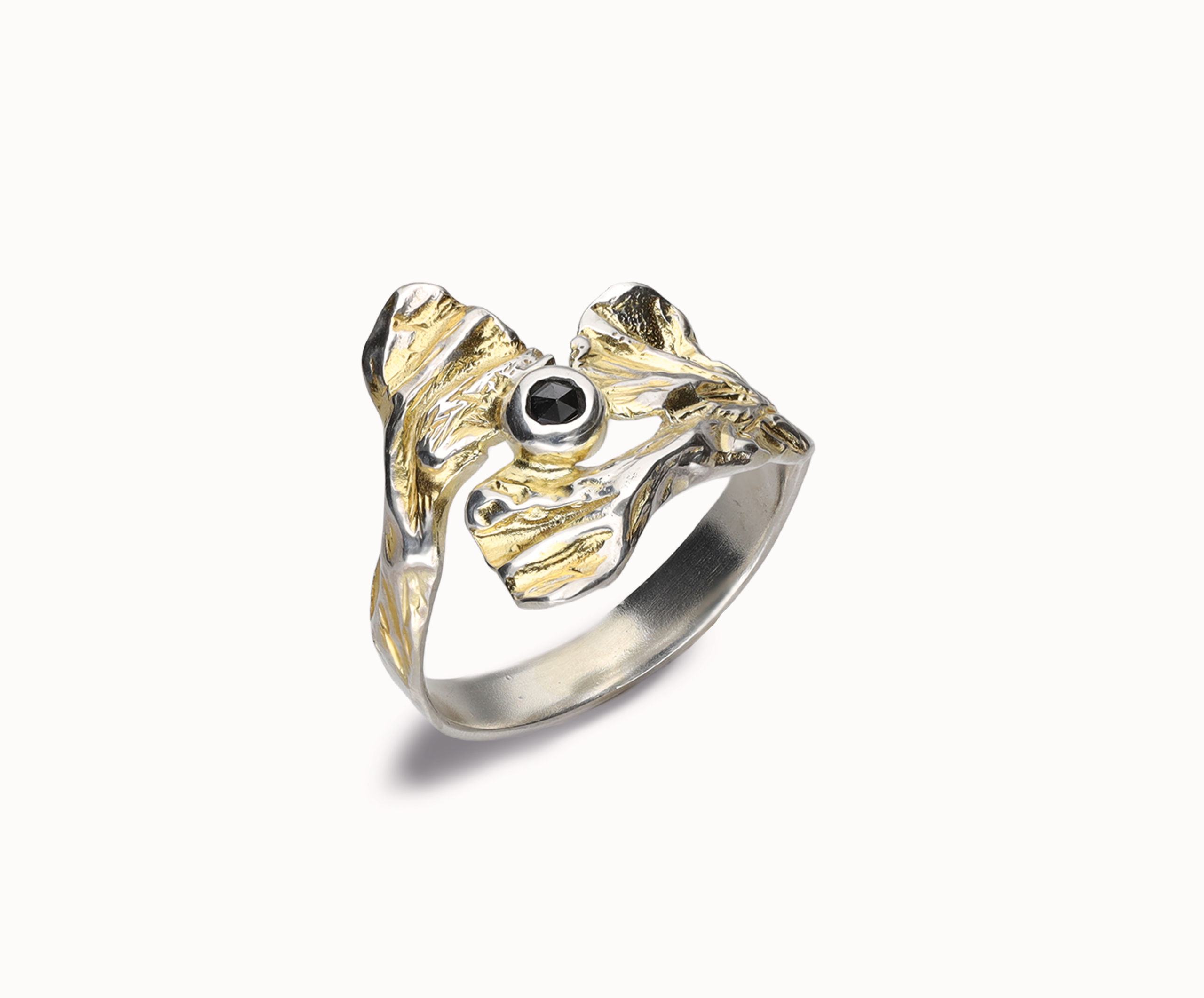 Prezentowany artystyczny pierścionek zachwyca swoją rzeźbiarską formą, która w mistrzowski sposób łączy surowy charakter z wyrafinowaną elegancją. Wykonano go ręcznie z najwyższej jakości srebra próby 925, które zostało częściowo wykończone szlachetnym złoceniem 22-karatowym złotem, tworząc efektowny kontrast faktur i barw. Centralny element stanowi głęboko osadzony czarny diament, który swoim tajemniczym blaskiem nadaje całości niezwykłego charakteru. Nieregularna, organiczna struktura nawiązuje do stylu boho, czyniąc ten projekt doskonałym wyborem dla osób poszukujących nietuzinkowej biżuterii z duszą. Każdy egzemplarz jest małym dziełem sztuki, które wspaniale dopełni zarówno codzienne stylizacje, jak i wyjściowe kreacje, podkreślając indywidualny gust swojej właścicielki.
