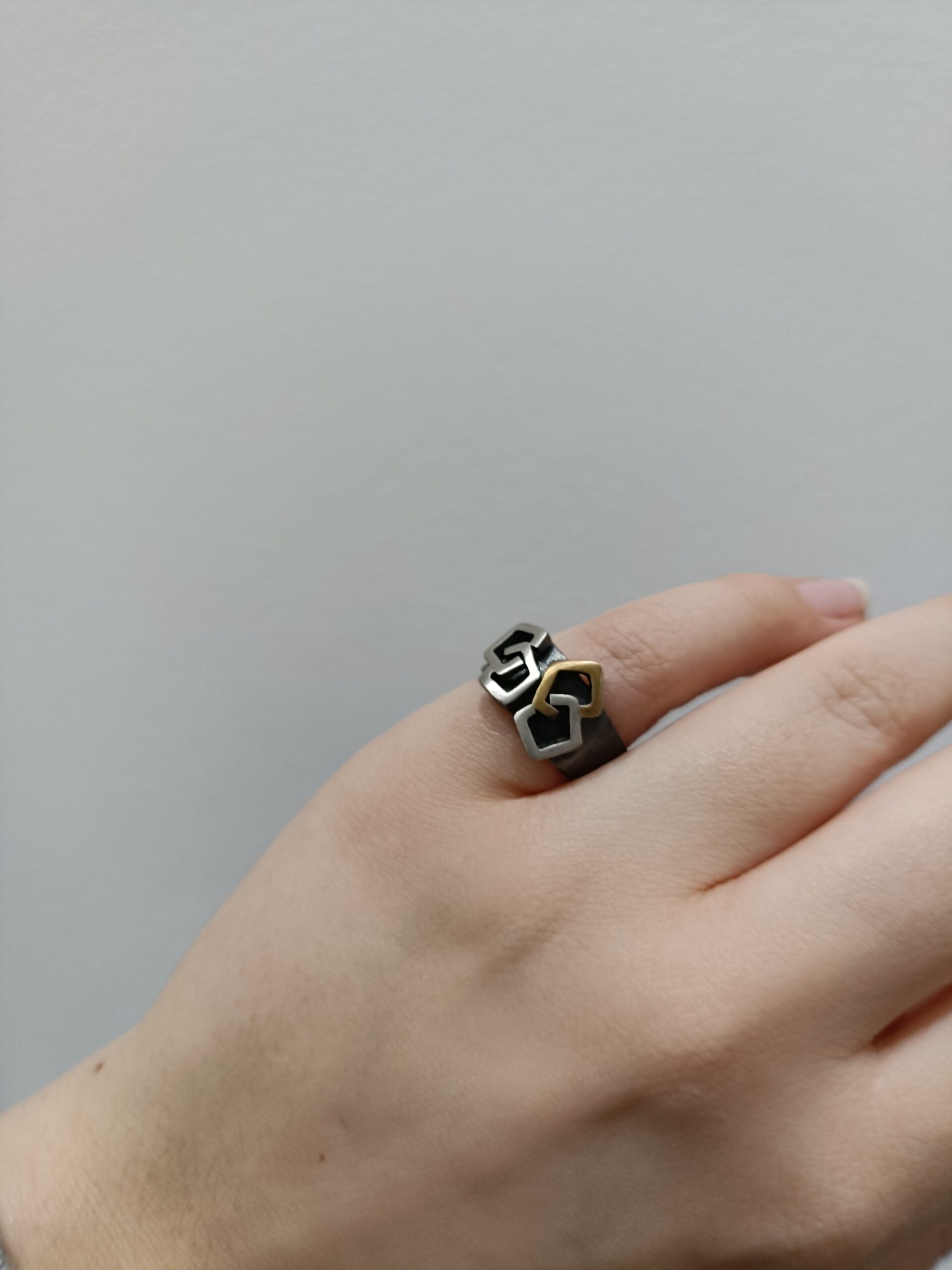 Szeroka obrączka ze srebra, oksydy i złota łączy w sobie głębię i industrialny charakter, intryguje klimatem. Centralnym punktem są trzy przestrzenne elementy o kształcie zbliżonym do rombów, z dynamicznym kontrastem.
