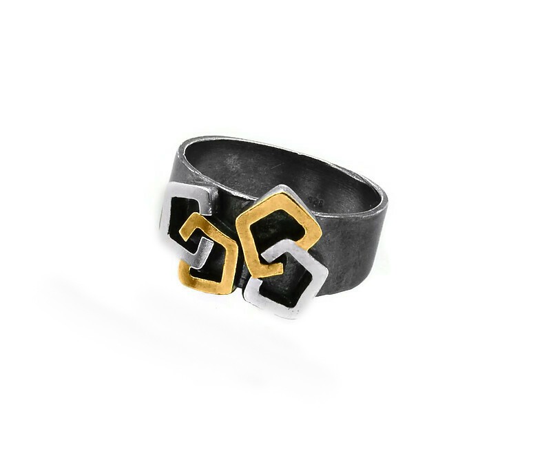 Pierścionek geometryczny w nowoczesnej formie. Wykonany z czystego srebra, z akcentami 22 karatowego złota, lekko oksydowany.