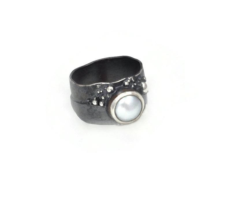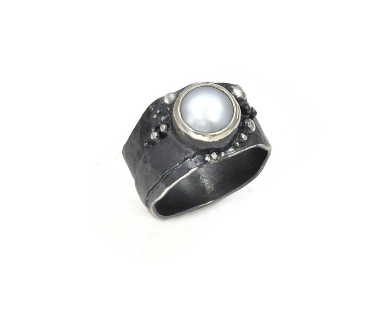 Oryginalny, perfekcyjnie wykonany pierścionek srebrny, z perłą hodowaną słodkowodną. Srebro lekko satynowane i oksydowane. Oprawa perły z jasnego srebra, podkreśla połysk i jakość perły. Szyna szeroka, zwężająca się pod palcem. Bardzo wygodny i “kuszący” design. Perfekcyjna praca złotnicza.