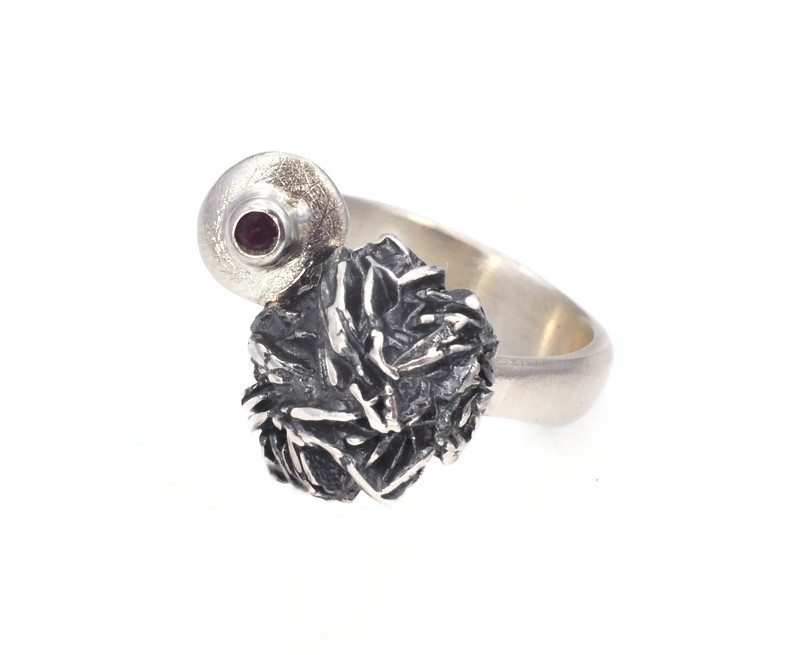 biżuteria artystyczna Margot studio, srebro oksydowane, pierścionek z rubinem, unikatowa biżuteria, awangardowa biżuteria, biżuteria ręcznie robiona