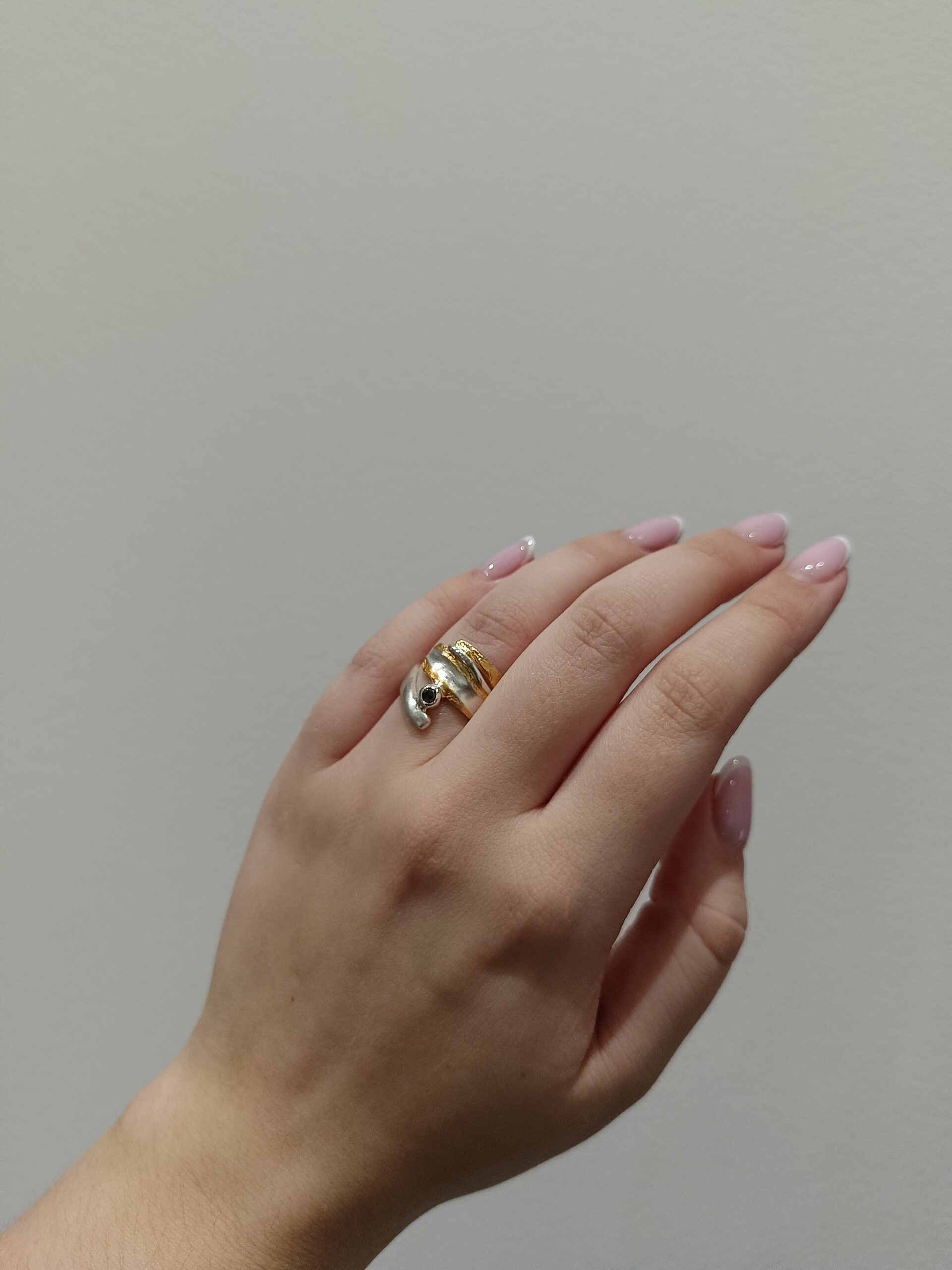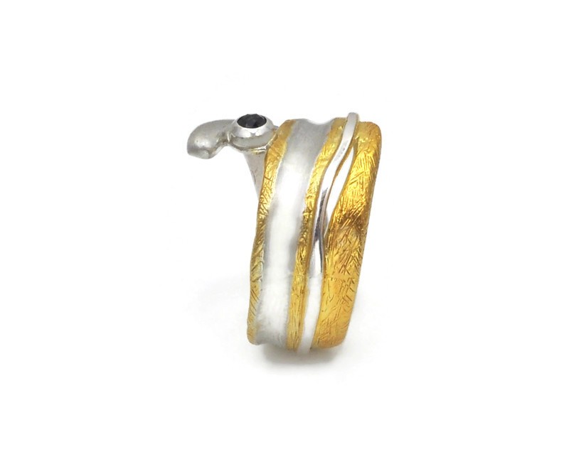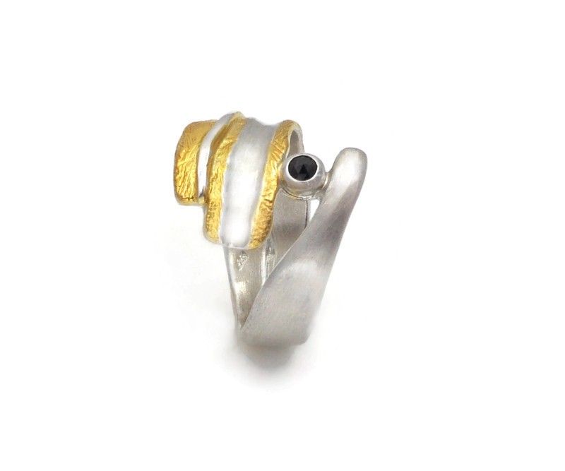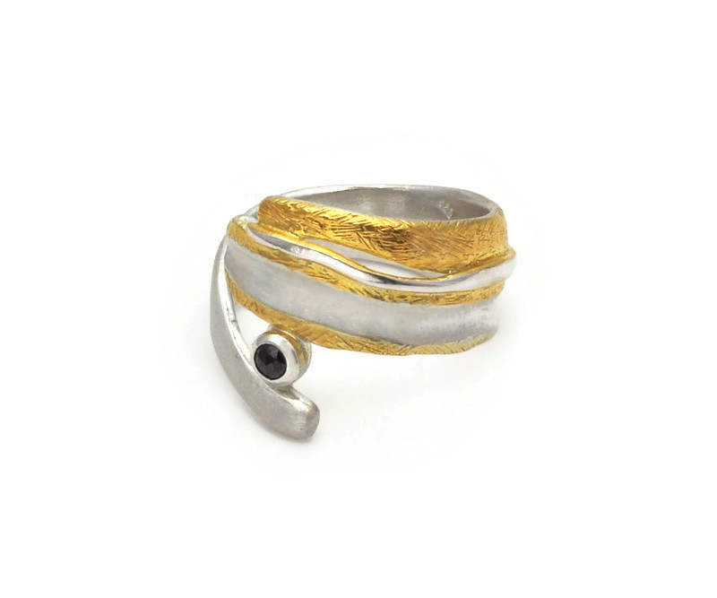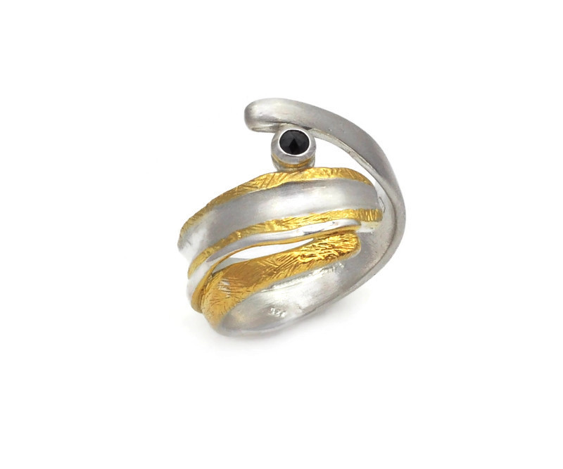 artystyczny pierścionek z czarnym diamentem, srebro złocone, oryginalny pierścionek z czarnym diamentem, rękodzieło, biżuteria artystyczna Margot studio,