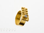 Elegnacki, artystyczny pierścionek wykonany w srebrze AG925, złocony całkowicie 24 kr złotem koloru żółtego. W centralnej części osadzono białą cyrkonię, która ciekawie współgra z okrągłymi elementami. Szyna szeroka płaska. Wyrób wykonany całkowicie ręcznie, w jednym egzemplarzu. Perfekcyjna praca złotnicza.