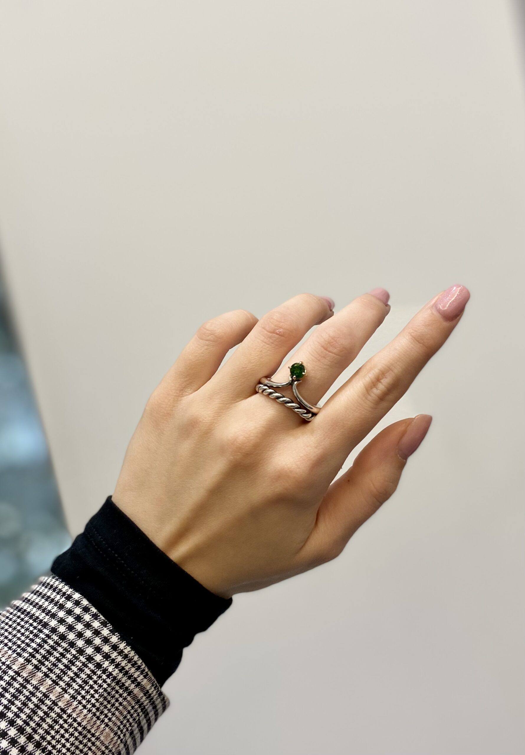 Oryginalny, perfekcyjnie wykonany ręcznie, pierścionek srebrny próby 925, z akcentami złota próby 375, w roli głównej fasetowany diopsyd okrągłego szlifu. Szyna podwójna z dwóch okrągłych elementów. Mistrzowska praca złotnicza. Pierścionek elegancko spływa po palcu, wysmuklając dłoń.