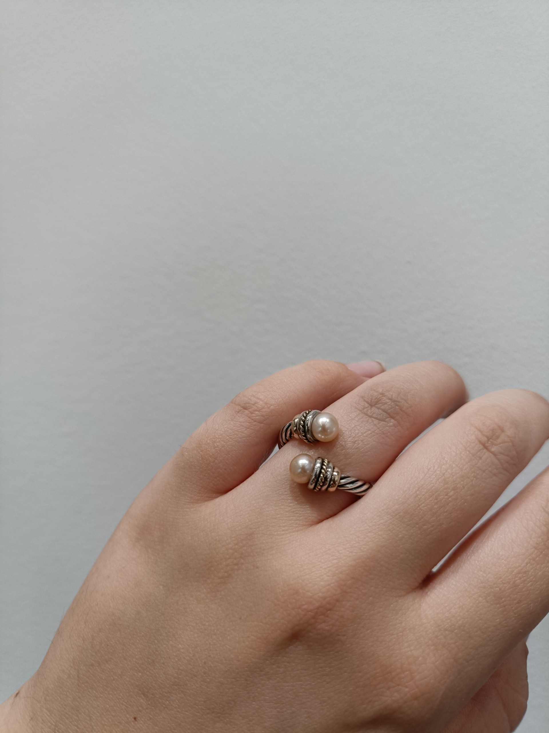 Oryginalny, perfekcyjnie wykonany ręcznie, pierścionek srebrny próby 925, z akcentami złota próby 375. W roli głównej 2 perły hodowane, słodkowodne barwy łososiowej. Szyna skręcana z 3 okrągłych drutów srebrnych, oksydowanych. Pierścionek elegancko spływa po palcu, wysmuklając dłoń. Szyna tzw. mijanka, pozwala regulować wielkość.