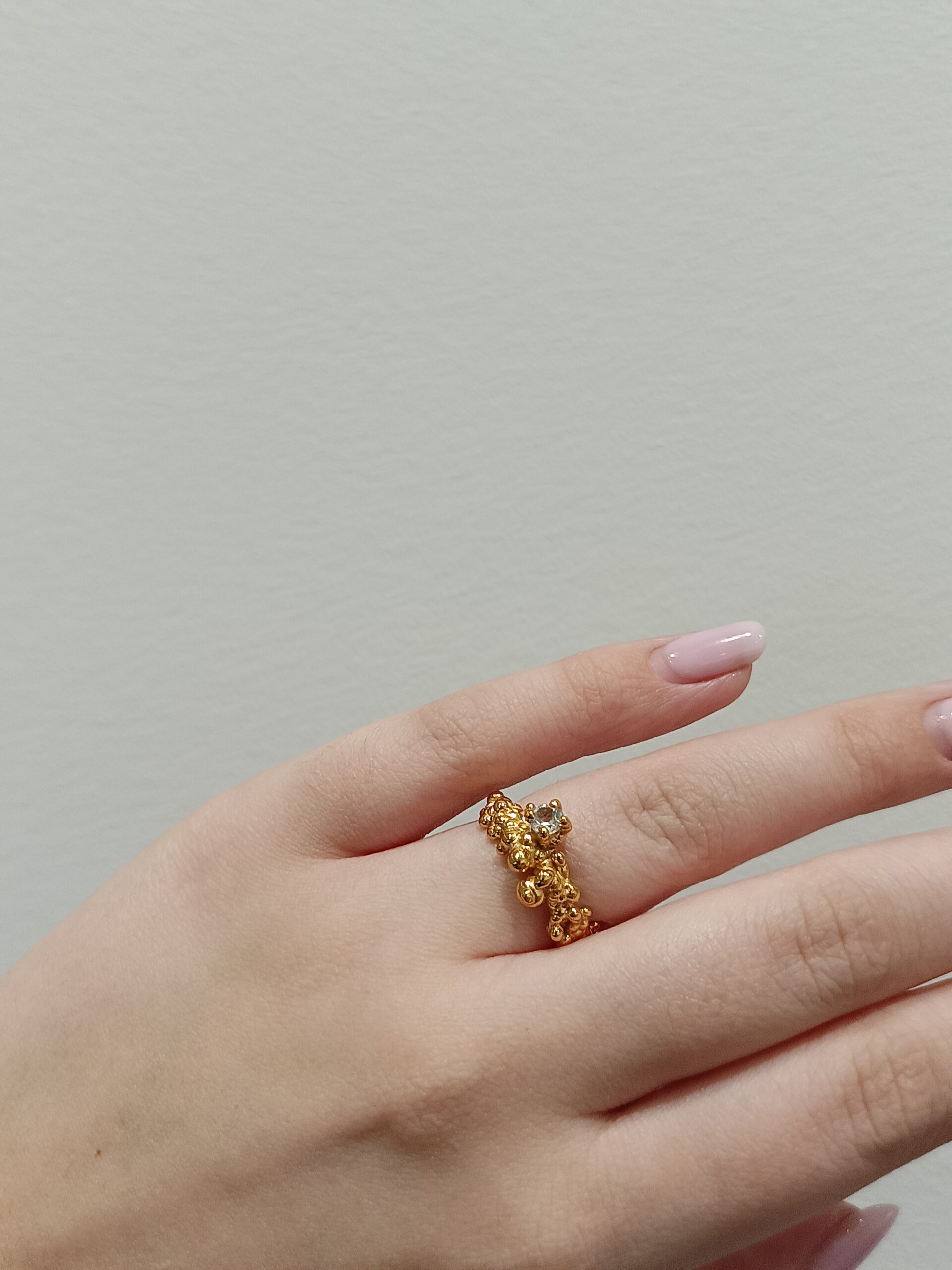 Delikatny pierścionek wykonany ze srebra próby 925, złocony 22 karatowym złotem. Centralnym elementem przyciągającym uwagę jest biały fasetowany topaz osadzony w łapki, na szynie wykonanej z ozdobnych kuleczek. Szyna ma nieregularny kształt. Pod palcem zwęża się i jest gładka.