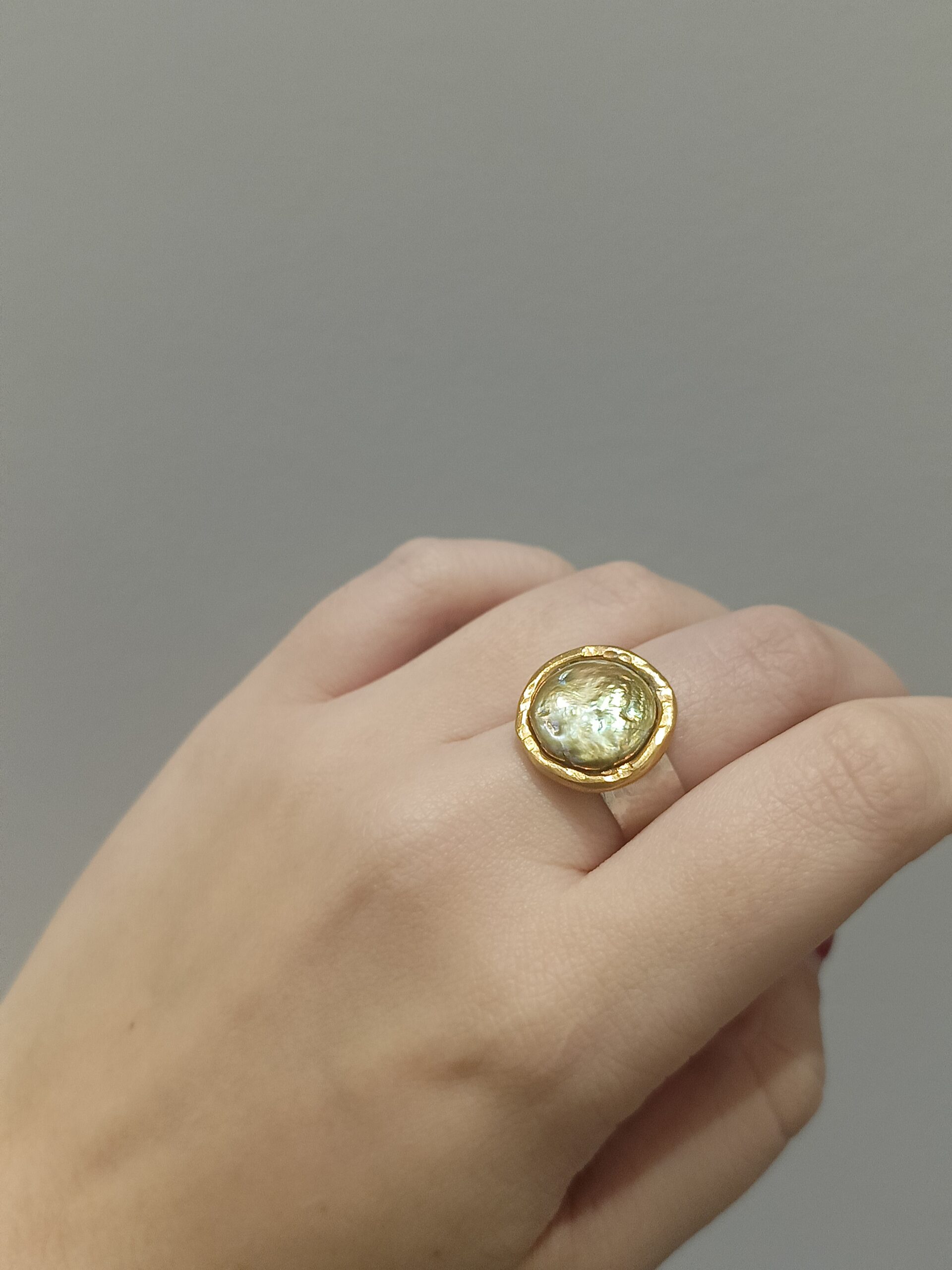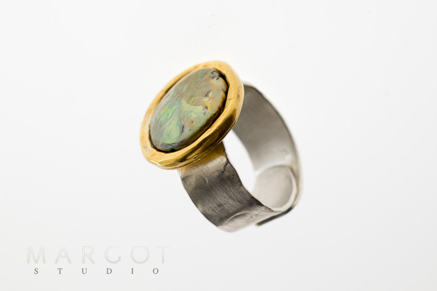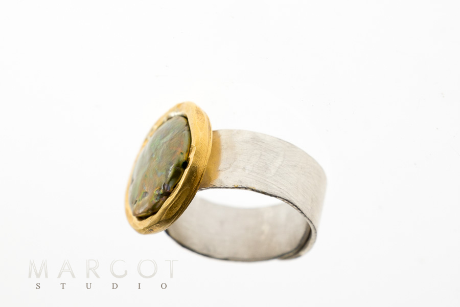 Wyjątkowy, artystyczny pierścionek srebrny z perłą hodowaną płaską (tzw. mabe) barwy zielono-seledynowej. Centralnym elementem pierścionka jest rzadko spotykana perła o nieregularnej strukturze i ciekawej barwie oraz wysokim połysku. Złocona złotem oprawa perły, nadaje pierścionkowi elegancji i luksusowy wygląd. Obrączka pierścionka wykonana jest z jasnego srebra i ma matowe wykończenie, co stanowi interesujący kontrast dla błyszczącej oprawy perły. Jej kształt jest prosty, co pozwala skupić uwagę na kamieniu.