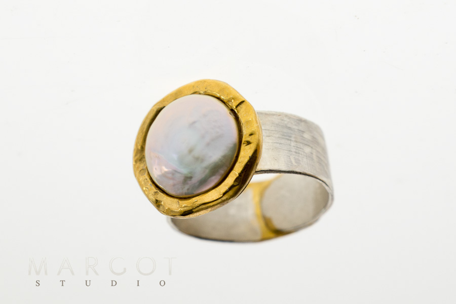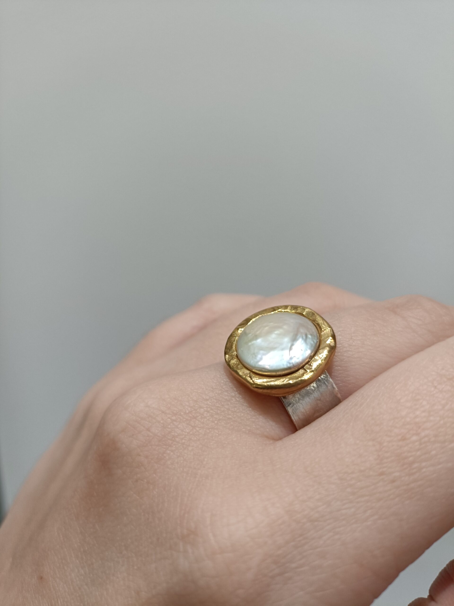 Wyjątkowy, artystyczny pierścionek wykonany ze srebra próby 925 ze złoconym akcentem 22 karatowym złotem i z perłą hodowaną płaską (tzw. mabe) białej barwy, z delikatnym łososiowym overtonem. W centrum pierścionka osadzono rzadko spotykaną perłę o nieregularnej strukturze i ciekawej barwie oraz wysokim połysku. Złocona oprawa perły, nadaje pierścionkowi luksusowego wyglądu. Obrączka (szyna) pierścionka wykonana jest z jasnego, satynowanego srebra, który pięknie kontrastuje ze złoconą oprawą. Pierścionek łączy w sobie elementy nowoczesnego designu z klasyczną elegancją. Połączenie różnych materiałów i faktur, nadaje biżuterii unikatowego charakteru.
