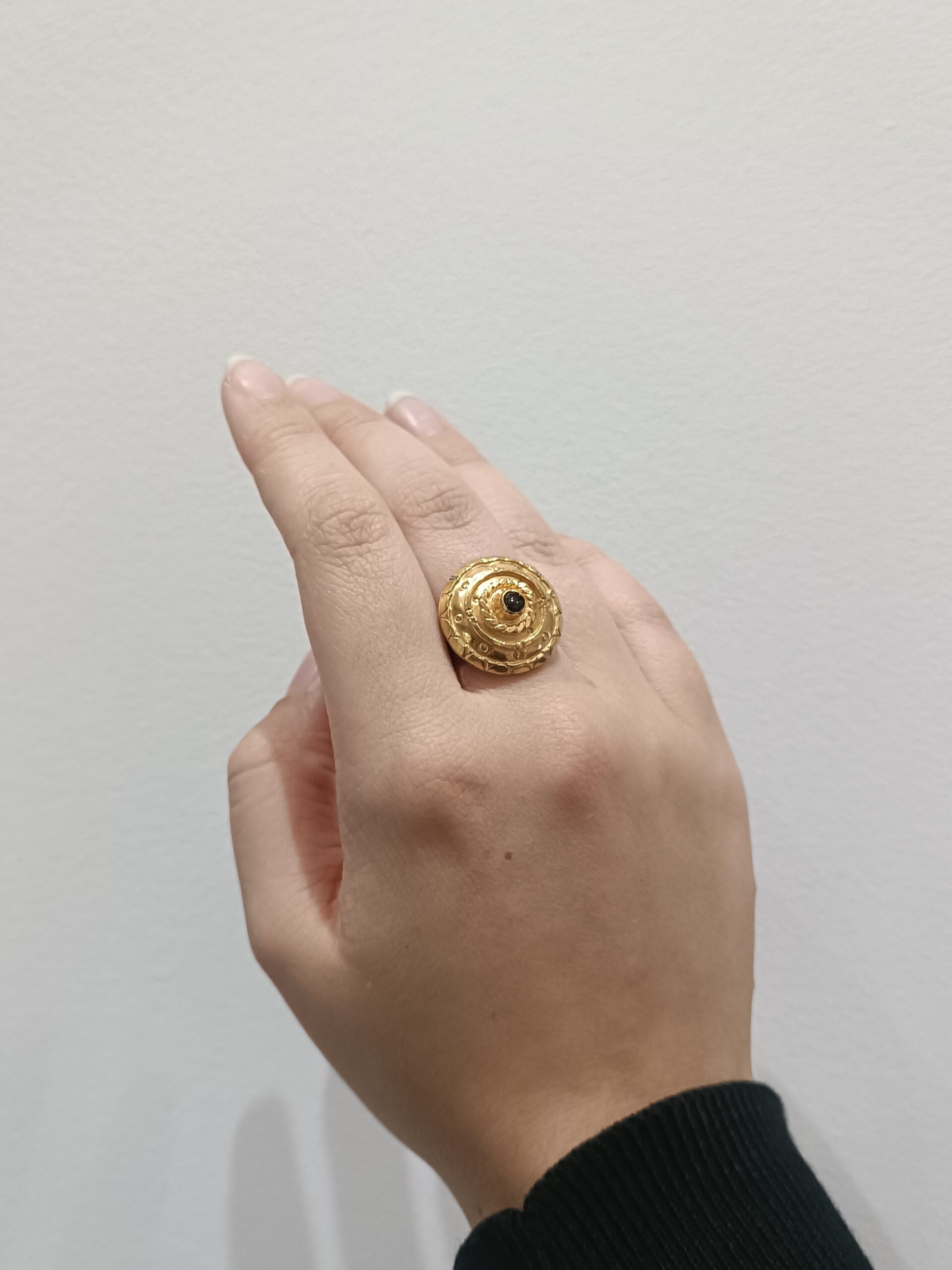 Wyjątkowy, luksusowy pierścionek w stylu retro. Wykonany ze srebra najwyższej próby i złota 22 karatowego. W centrum naturalny granat fasetowany, okrągły. Cudnie osadzony w okrągłej koronie, zdobionej akcentami w stylu hellenistycznym. Złocona część pierścionka przypomina antyczny motyw medalionu, co nadaje biżuterii charakteru historycznej elegancji.